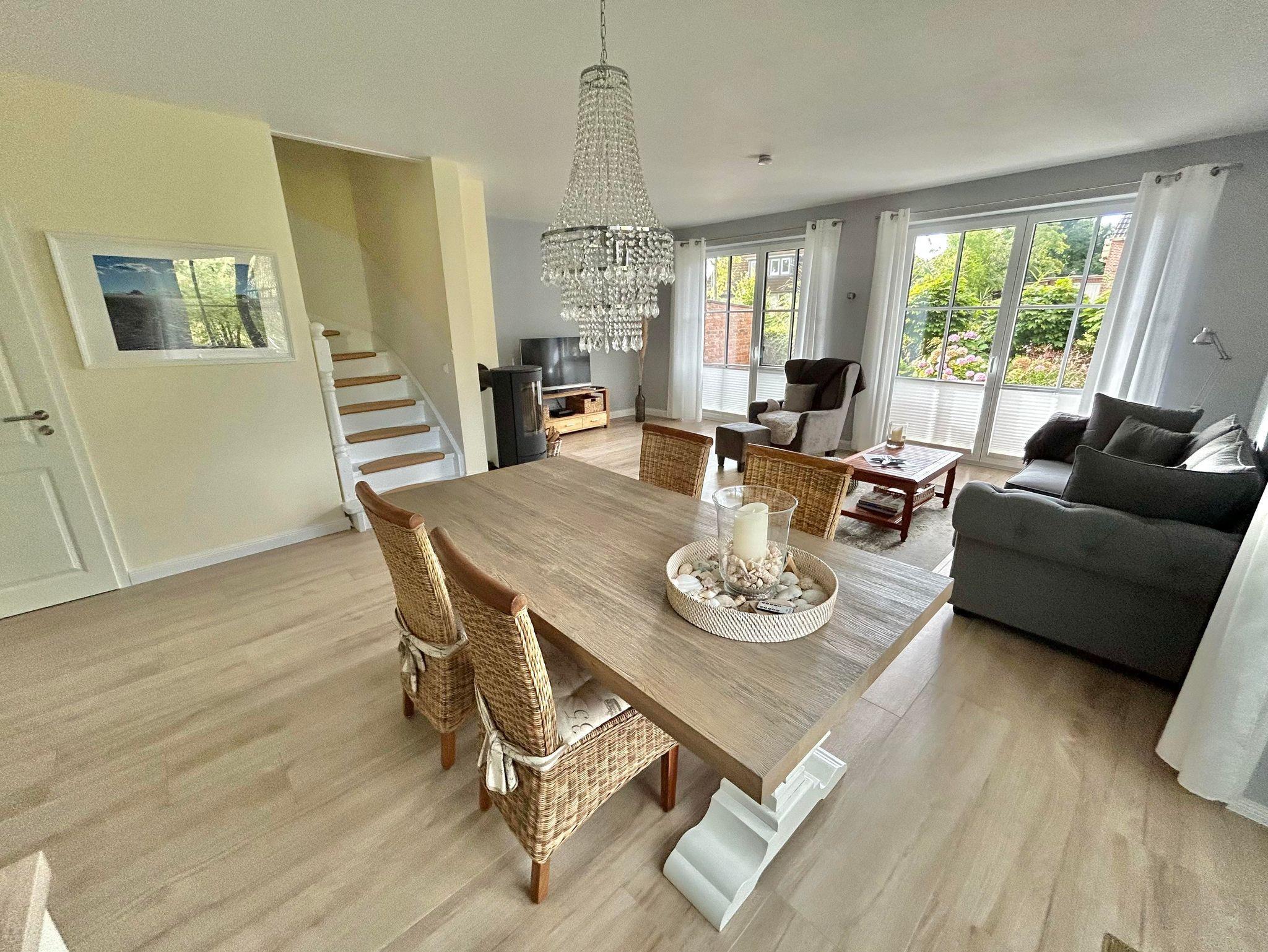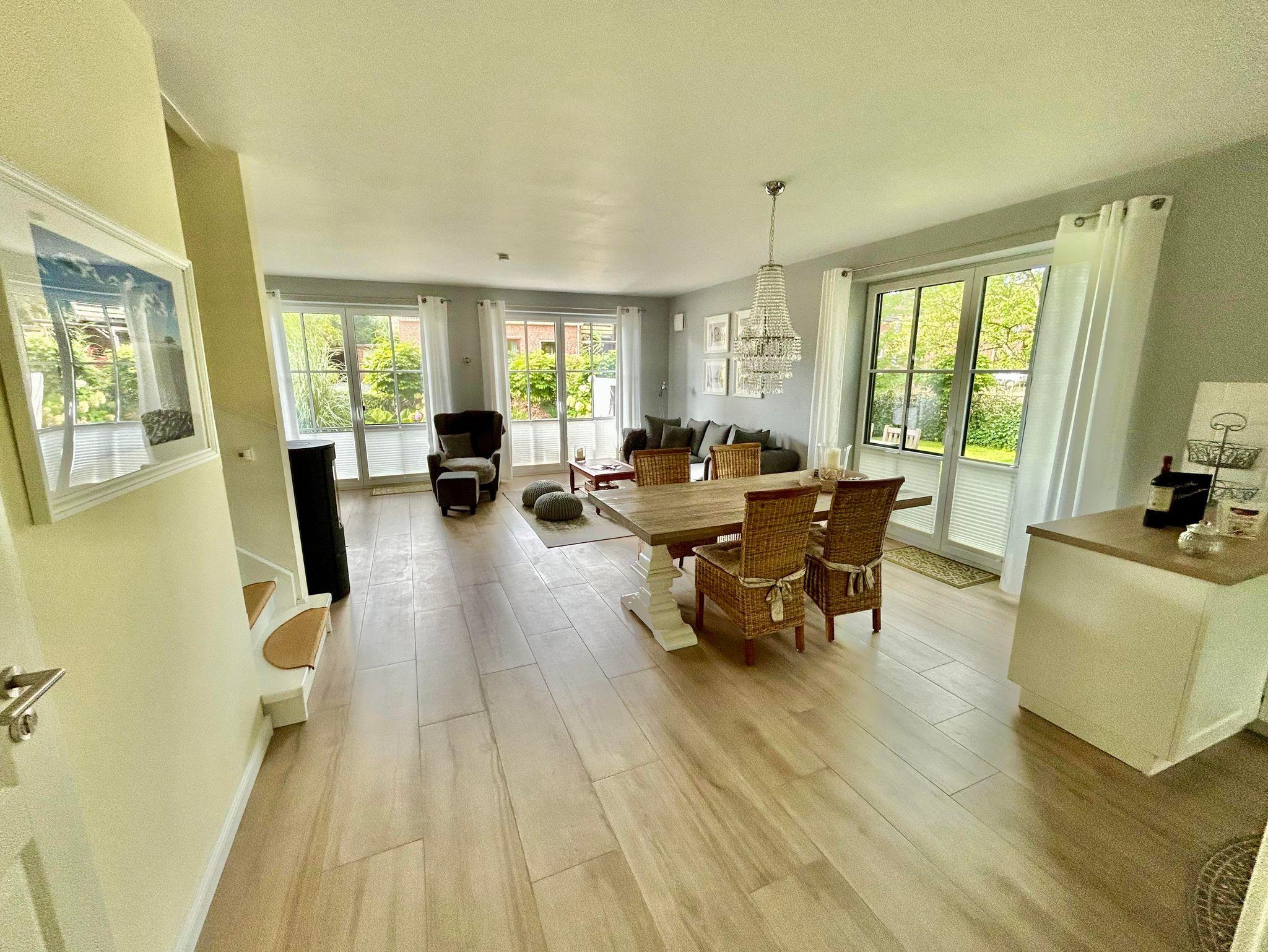 Lichtdurchfluteter Wohnraum mit großen Essbereich und angrenzender offener Küche, ausgestattet mit Markengeräten( Geschirrspüler,