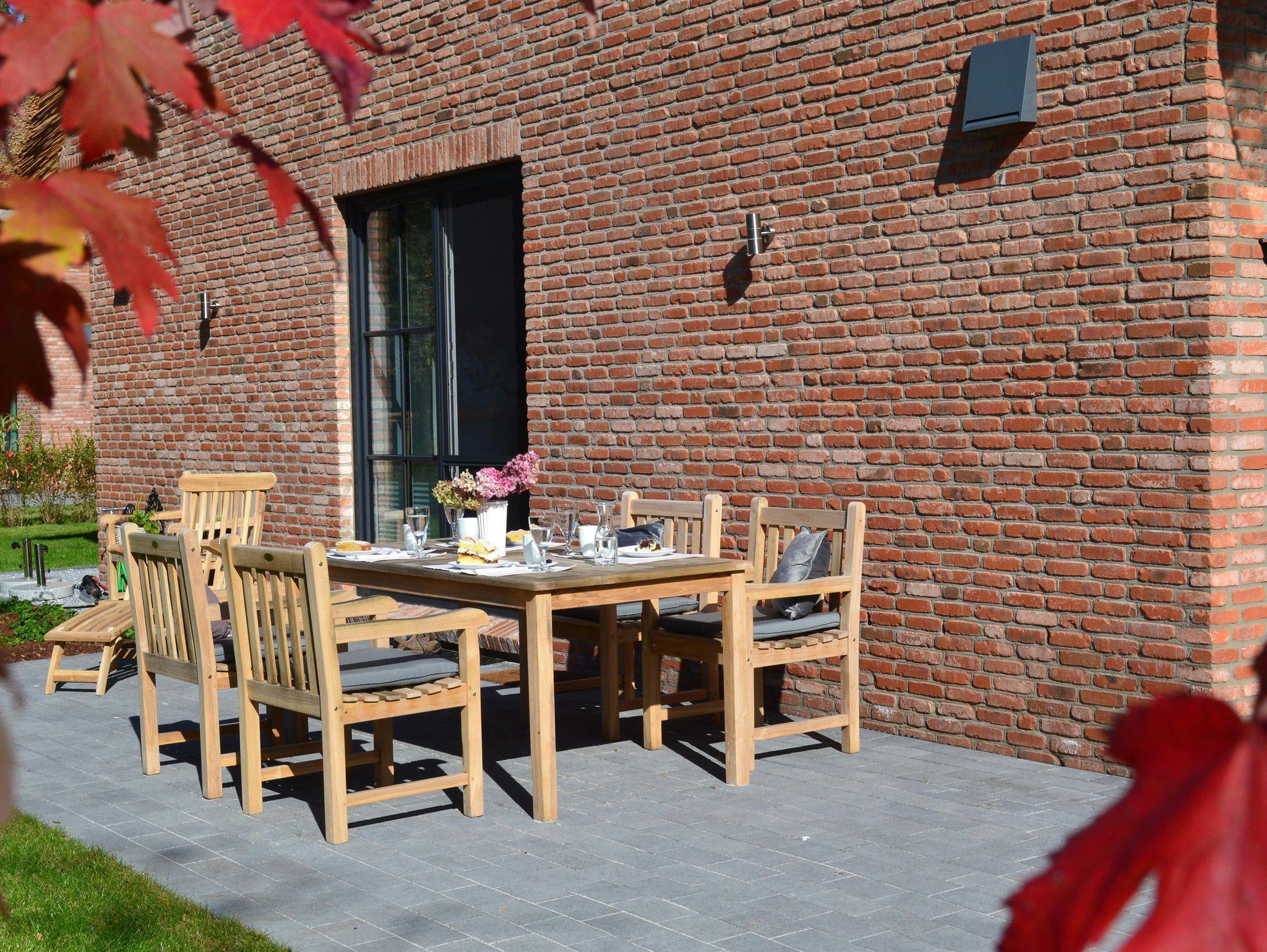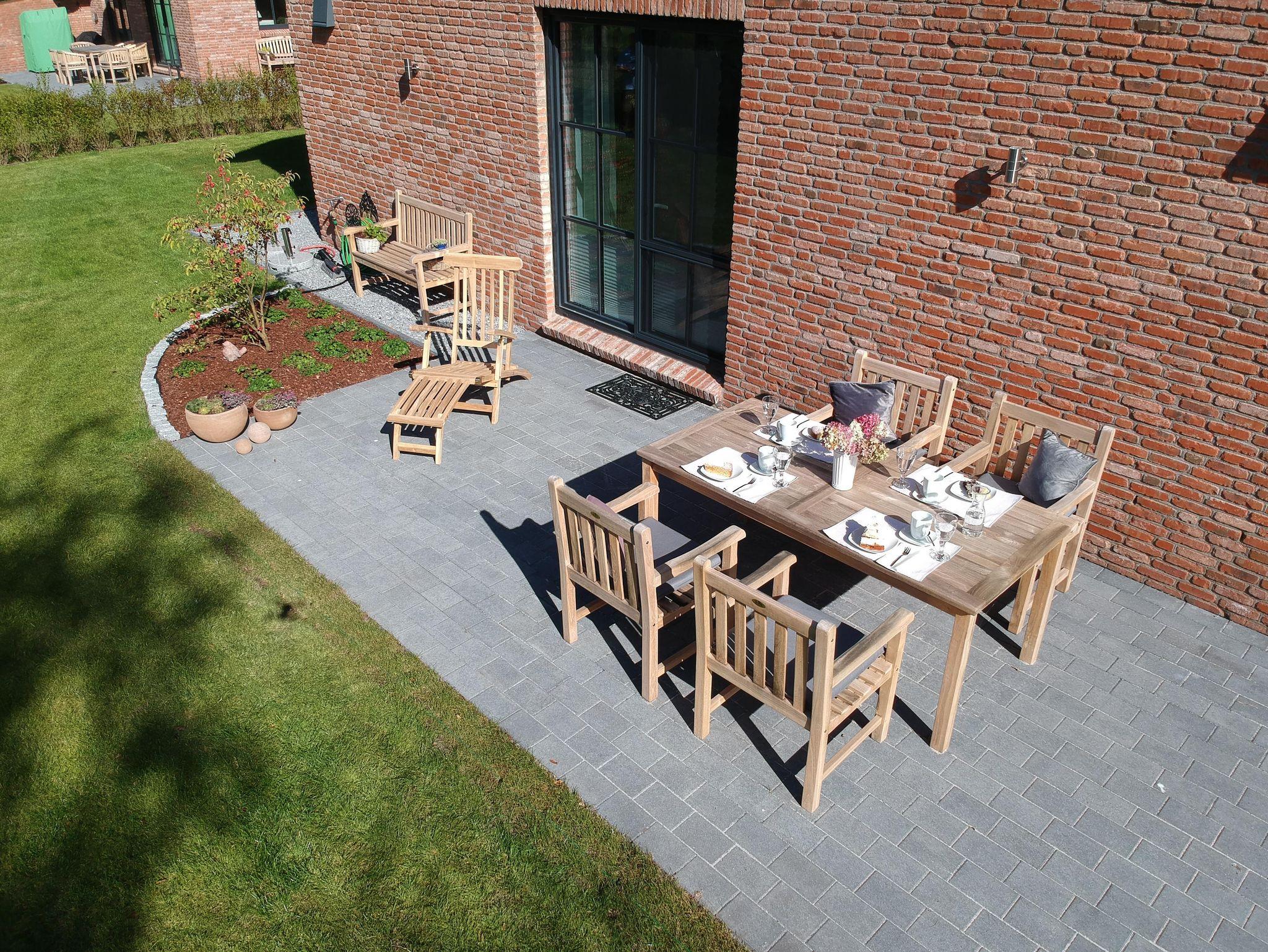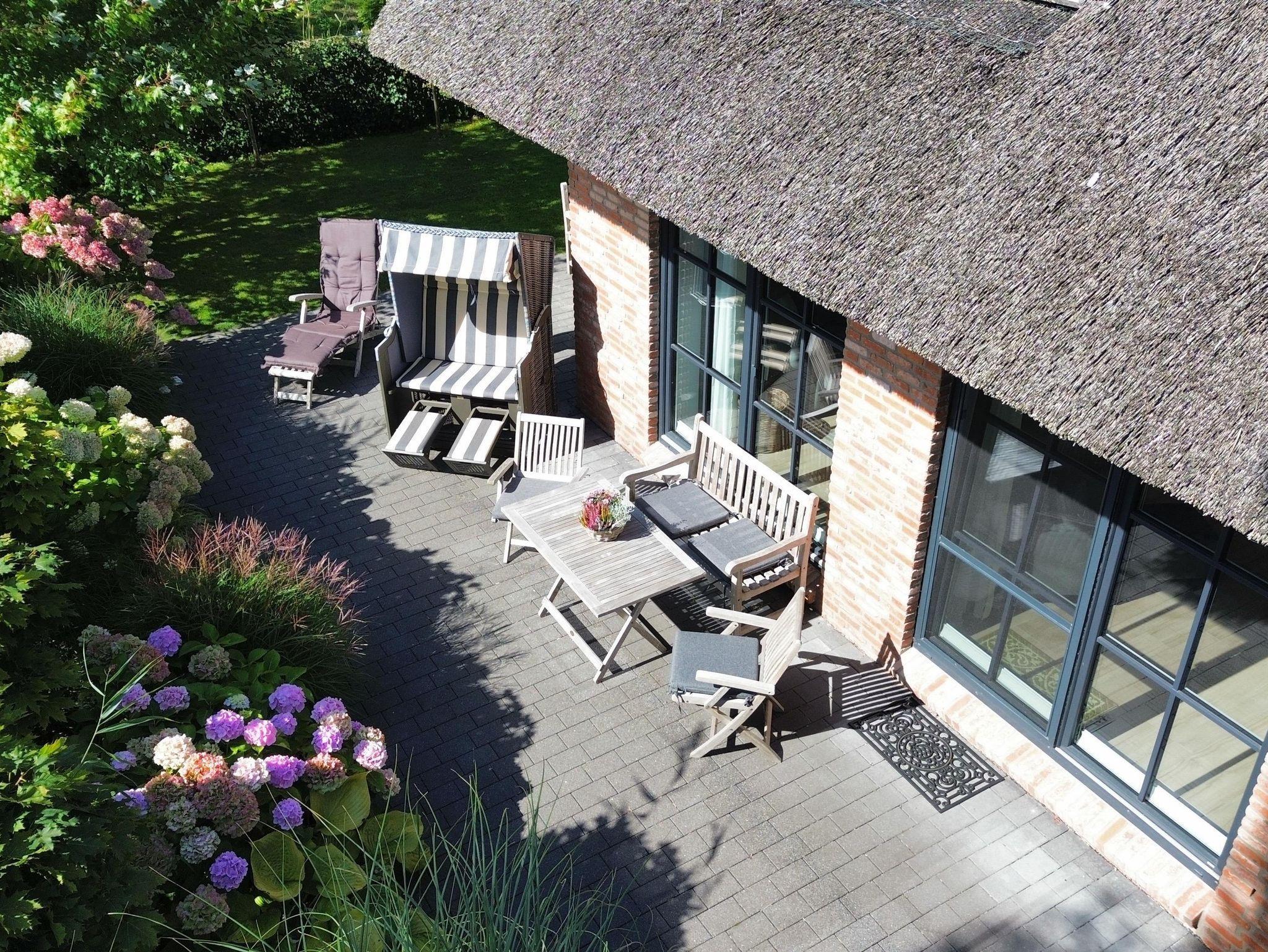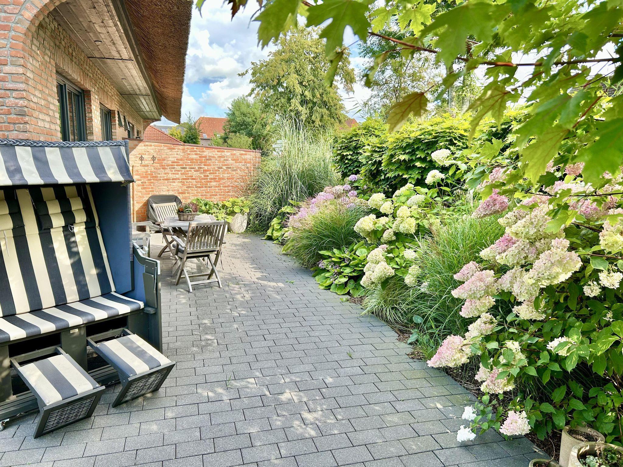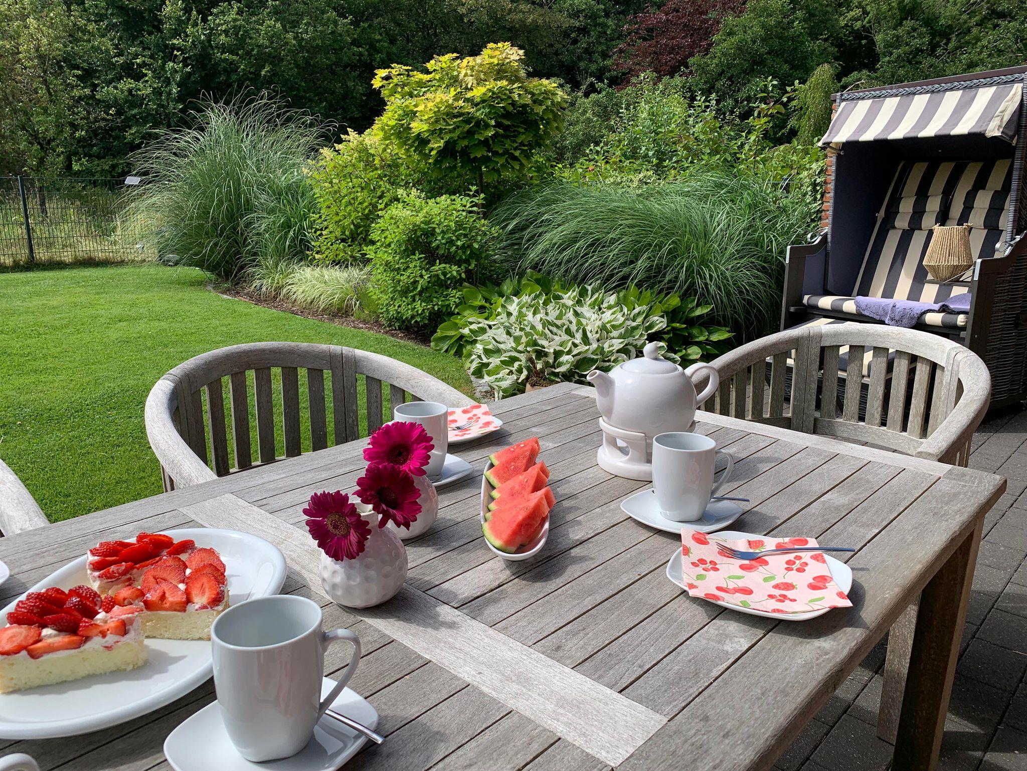 Die Terrasse ist möbliert mit einem Strandkorb, Teakholzsitzgruppe, Deckchair, Gartenbänken sowie elektrischen Grill.
