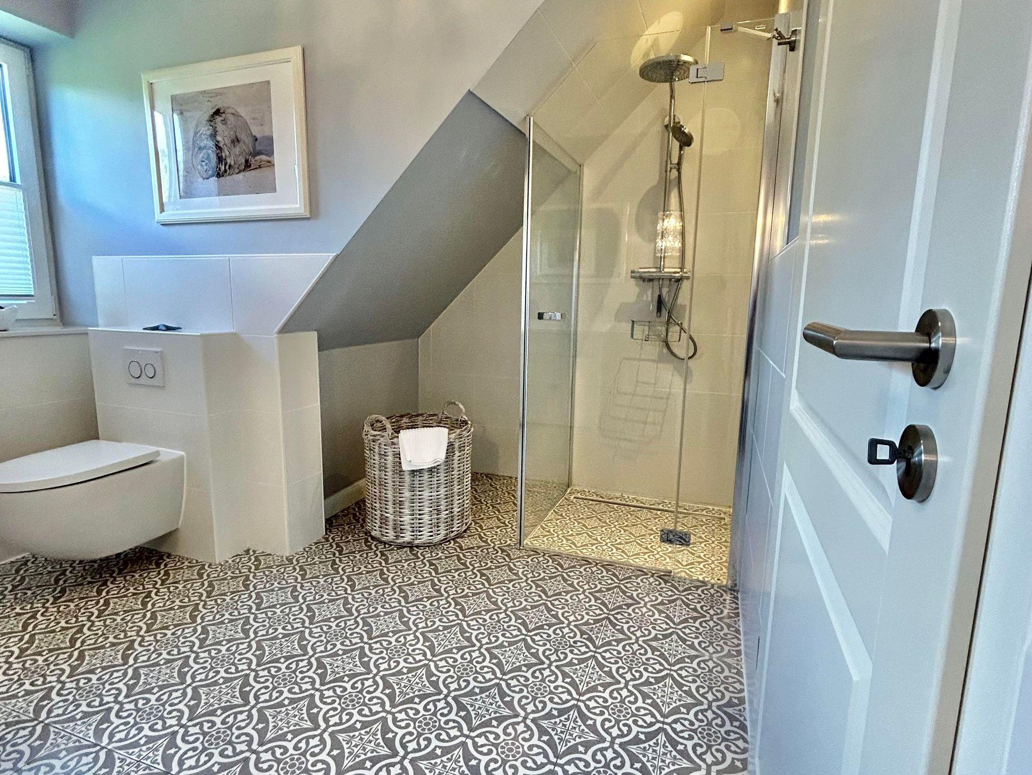 Ein weiträumiges Bad mit ebenerdiger Dusche, ausreichend Abstellmöglichkeiten und ein Föhn.
