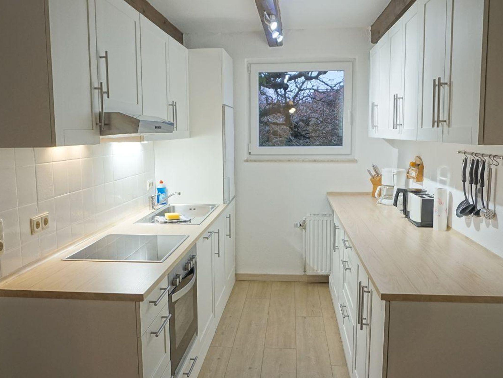 Besonders geschätzt wird die voll ausgestattete Küche, in der alle Utensilien für die Zubereitung von Mahlzeiten vorhanden sind. Dazu gehören ein Ceranherd mit Backofen (Elektroanschluss), Mikrowelle, Kühlschrank, Gefrierfach, Spülmaschine, Wasserkocher, Toaster, Kaffeemaschine sowie ausreichend Geschirr und Besteck. Praktische Helfer wie Bügeleisen, Waschmaschine (gemeinschaftliche Nutzung), Bügelbrett, Staubsauger und Wäscheständer erleichtern den Alltag auch während längerer Aufenthalte.