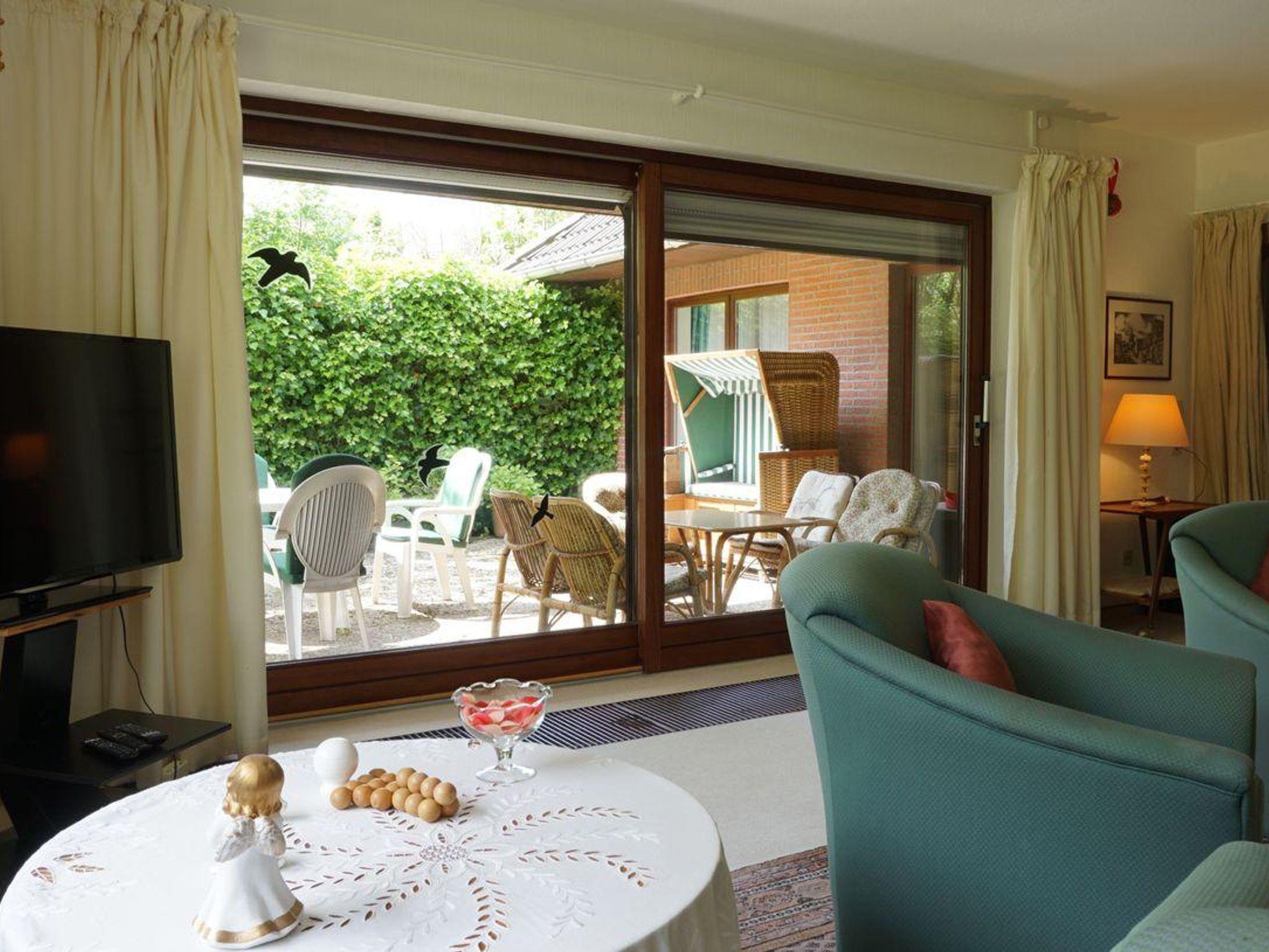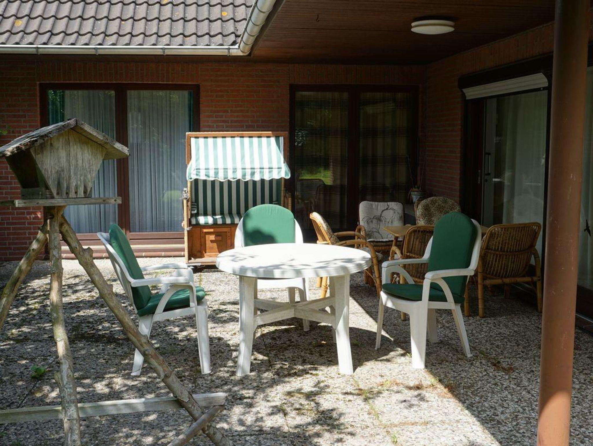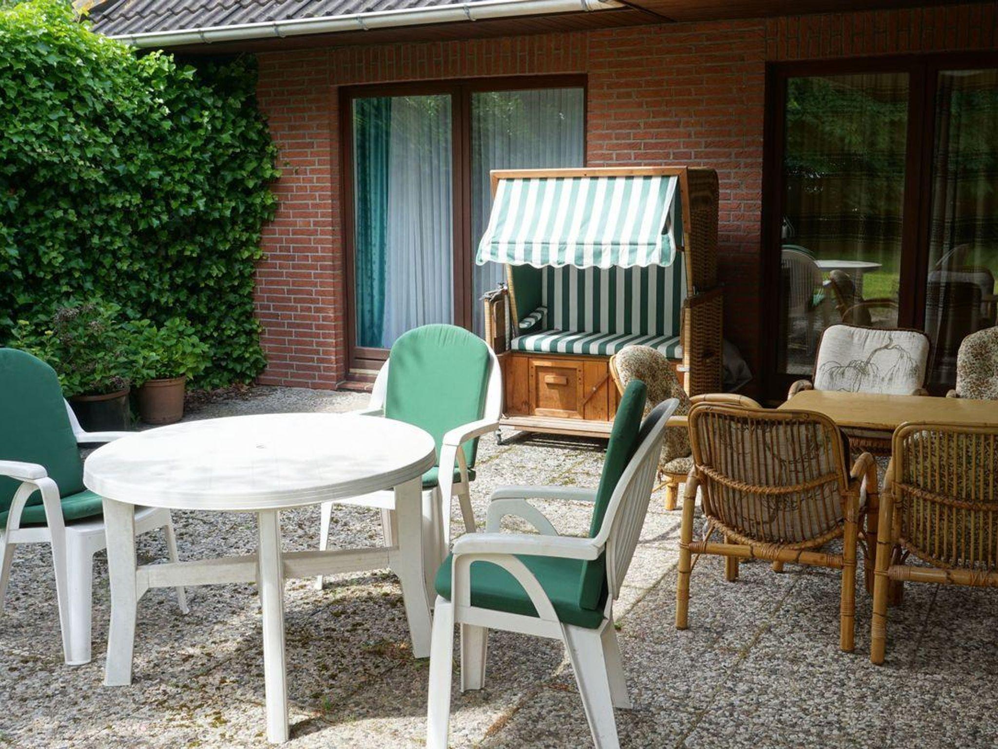 Der große, naturbelassene Garten mit möblierter Terrasse und Strandkorb lädt zum Entspannen ein. Im Garten ist eine Wäschespinne vorhanden für längere Aufenthalte. Zwei Parkplätze stehen direkt am Haus zur Verfügung.