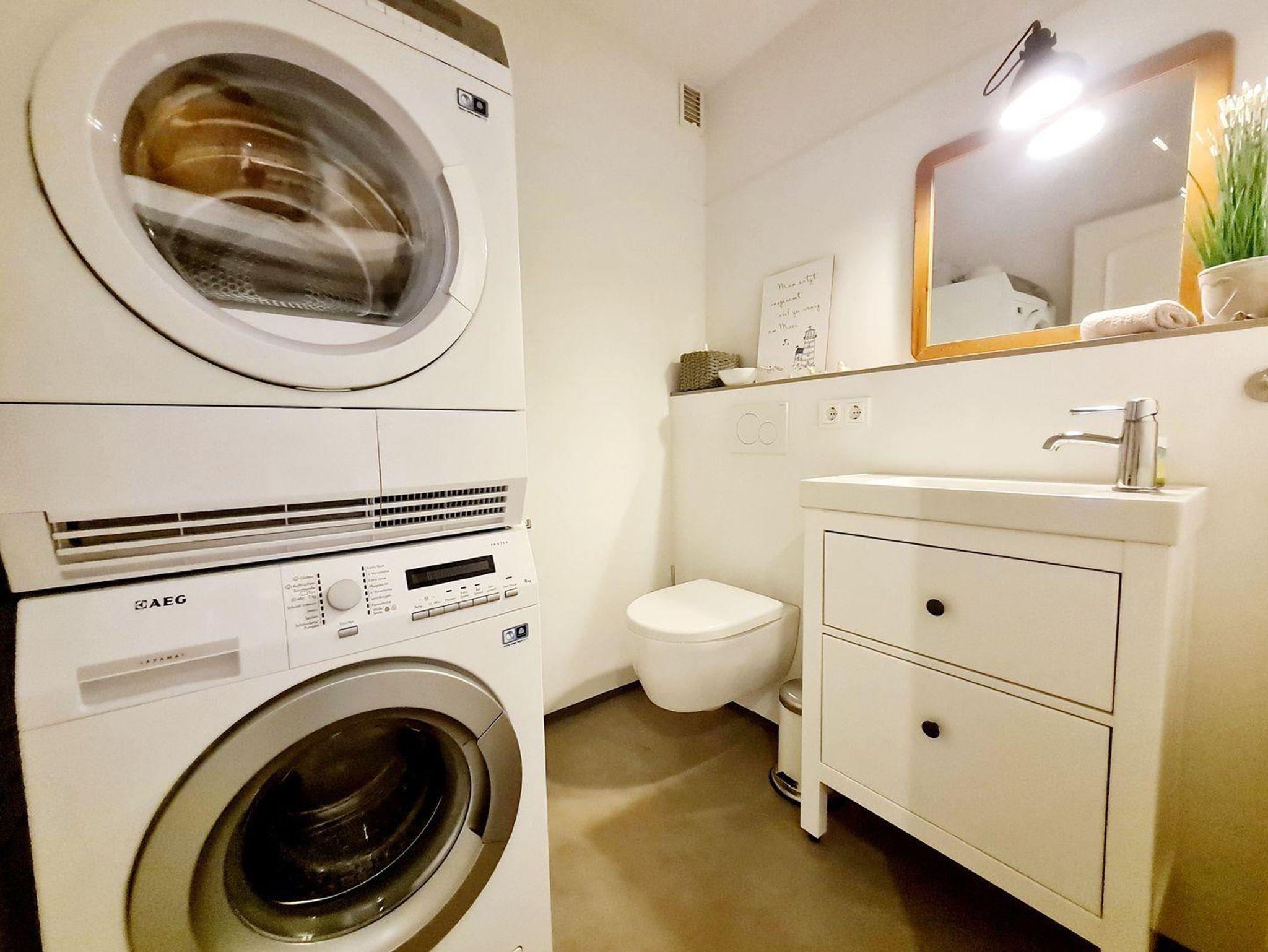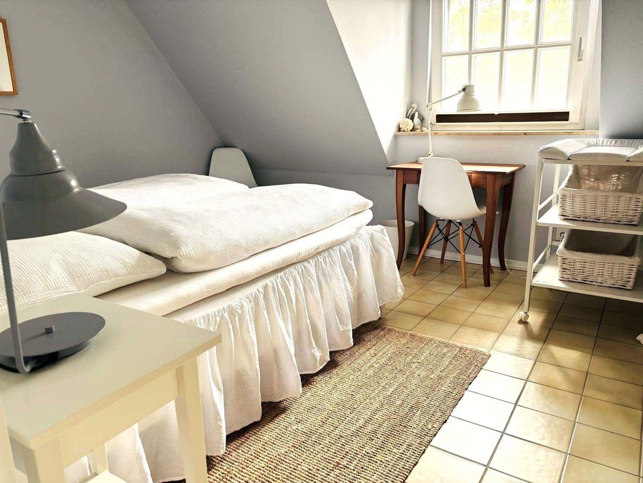 Im Erdgeschoß befindet sich außerdem das Gäste WC mit Waschmaschine und Trockner. Im Obergeschoß (gemütlich unter Reet ) befinden sich 2 separate Schlafräume (1 Doppelbett 1.80x2.00 und 1 Doppelbett 1.40x2.00) mit genügend Schrankraum , außerdem das großzügige Duschbad mit WC .