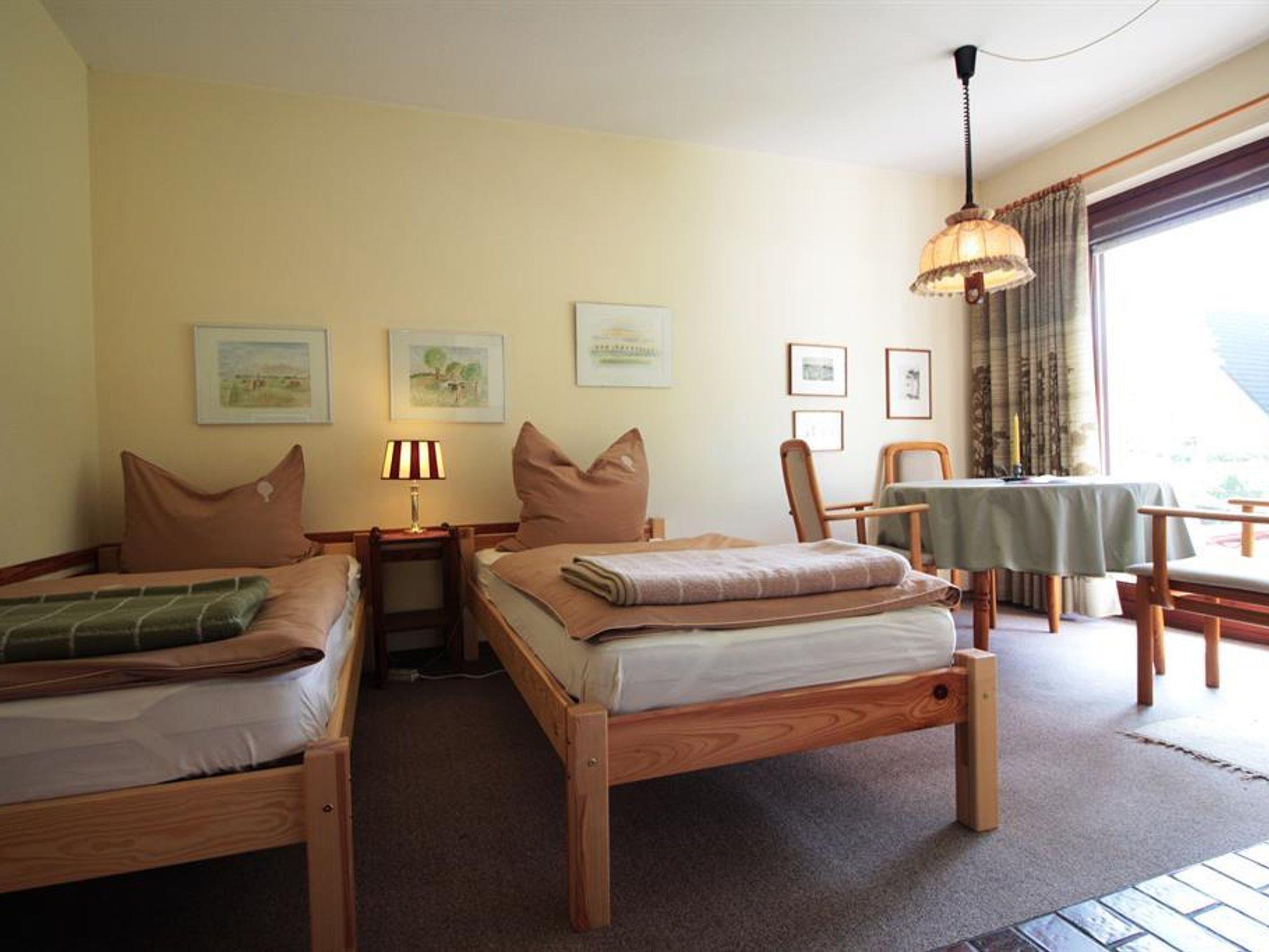 Das Studio ist mit Esstisch, 2 Stühlen sowie 2 Einzelbetten (zusammenstellbar) eingerichtet.