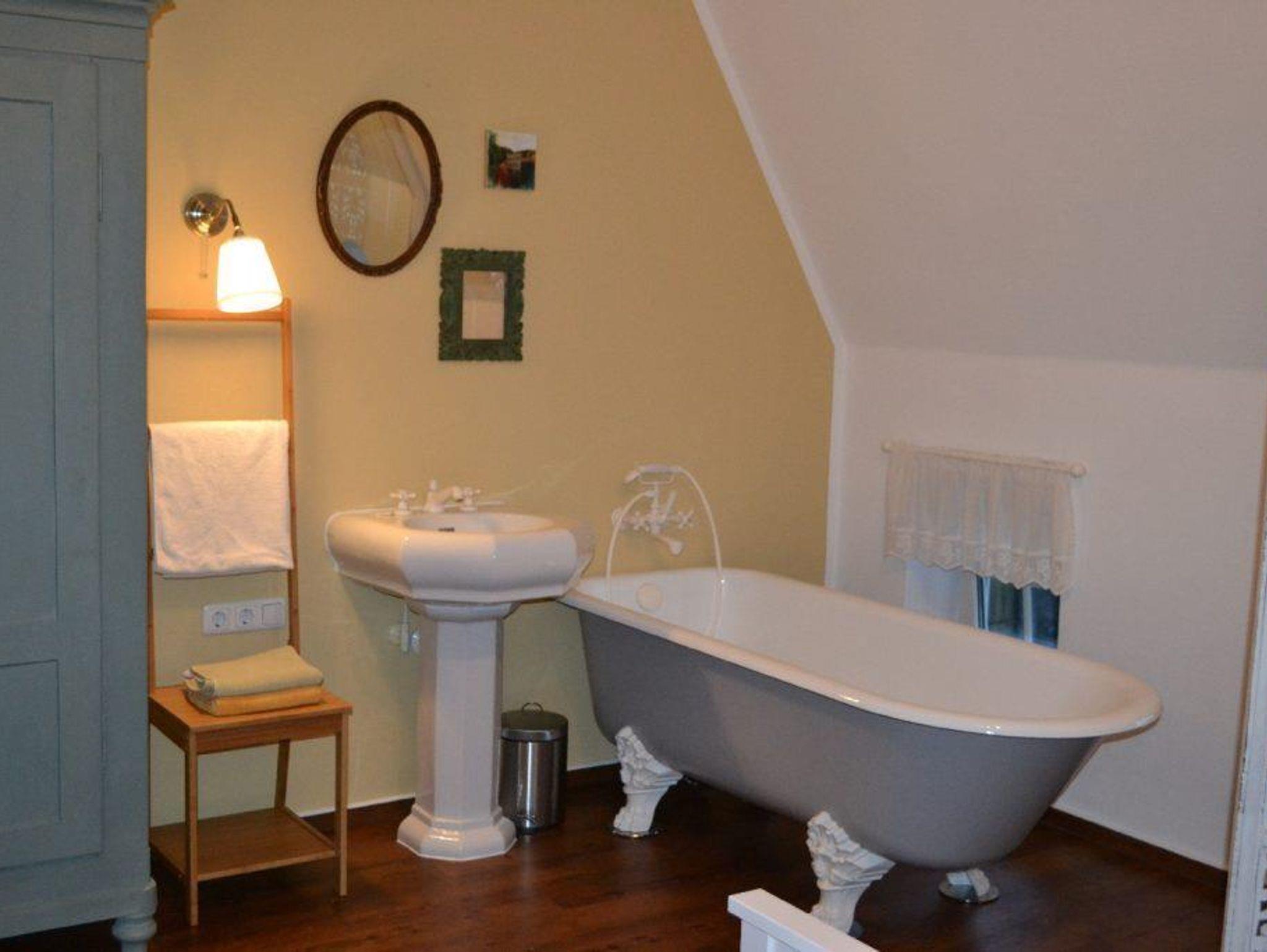 Schlafzimmer mit Doppelbett, freistehende romantische Badewanne