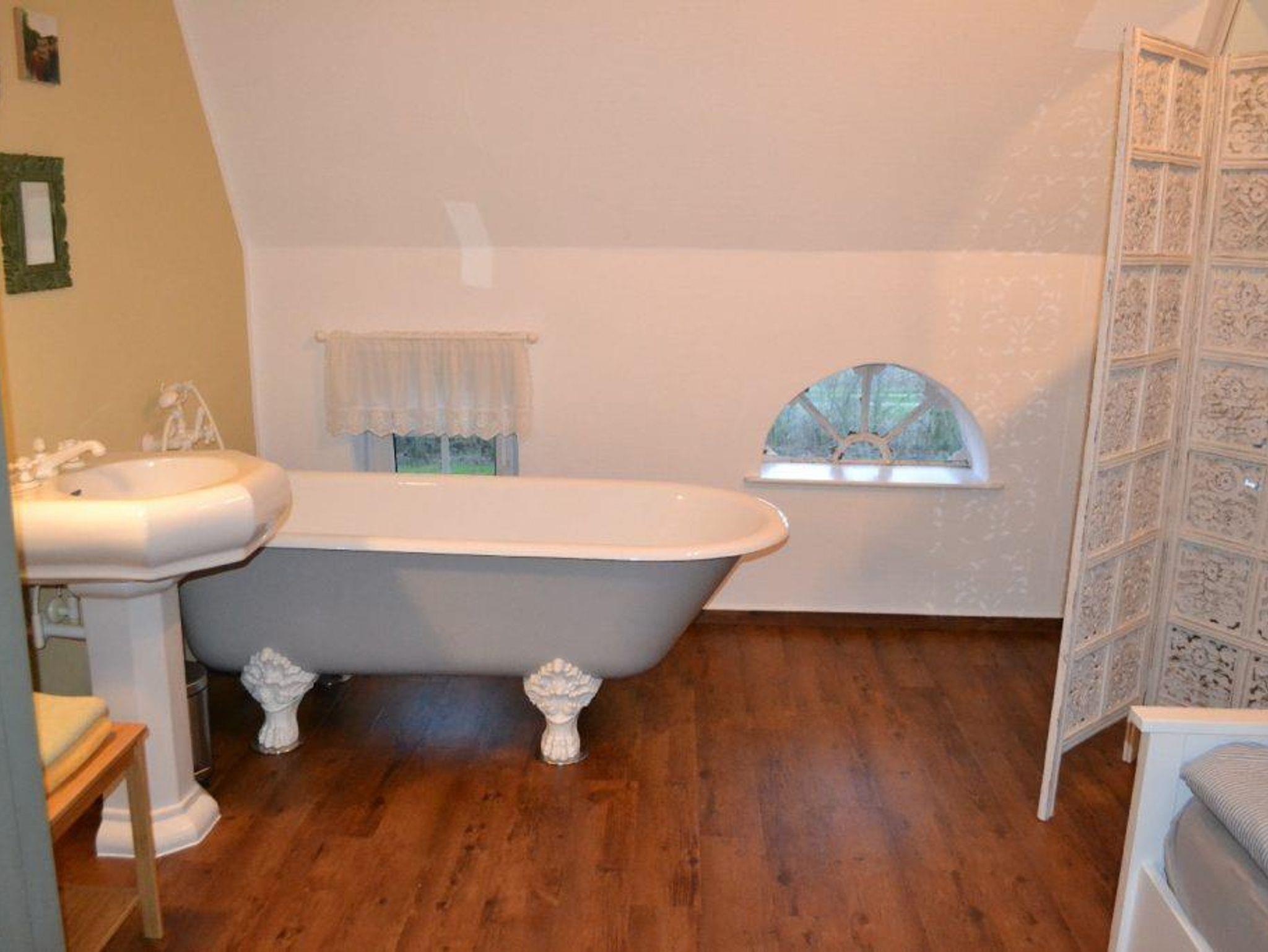 Die Einrichtung im modernen Landhausstil, Kamin und möblierter Terrasse runden das Urlaubsflair ab. Ein besonderes Highlight ist die freistehende Badewanne im Schlafzimmer