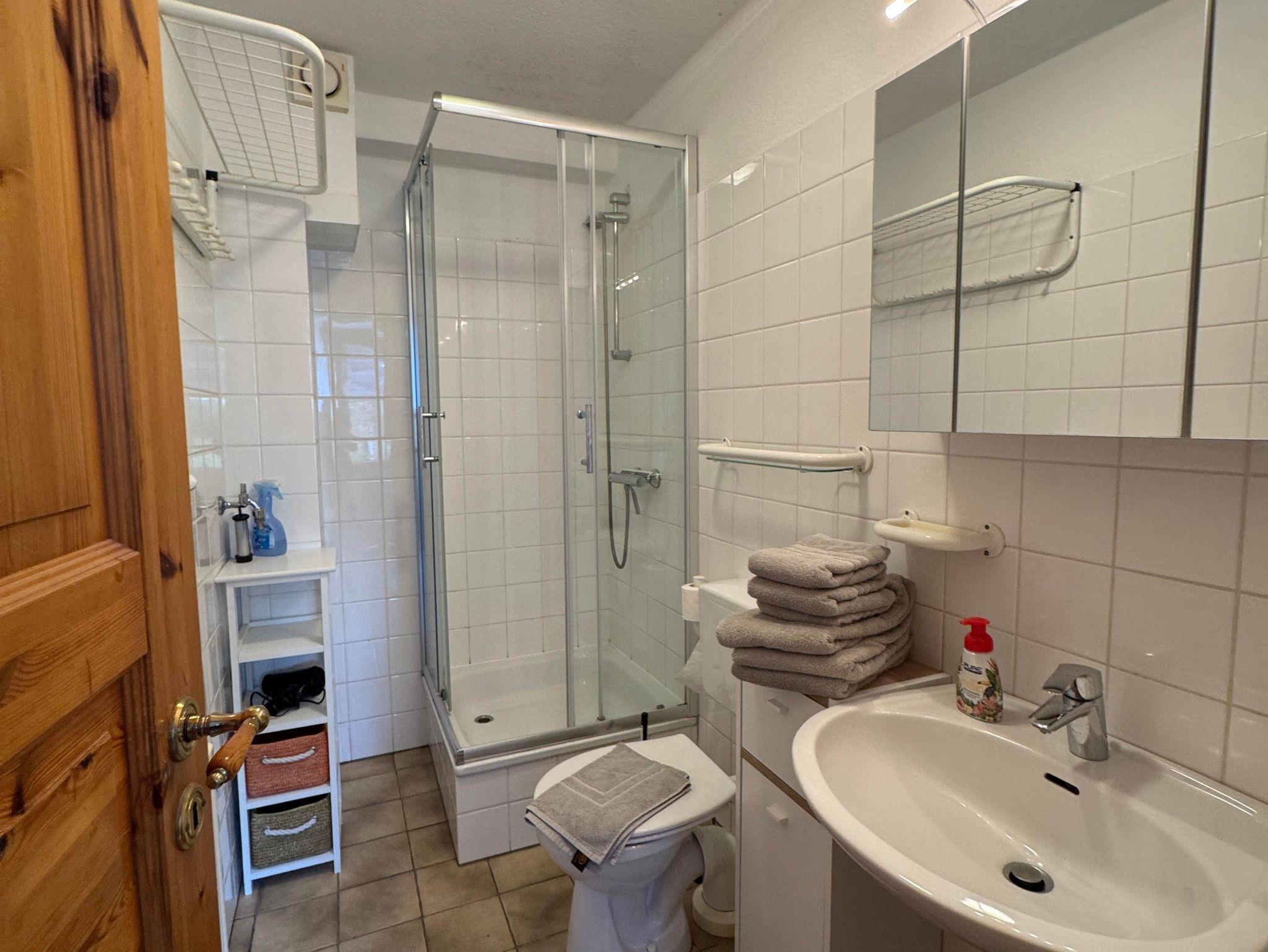 Das Badezimmer verfügt über ein WC und eine Dusche.