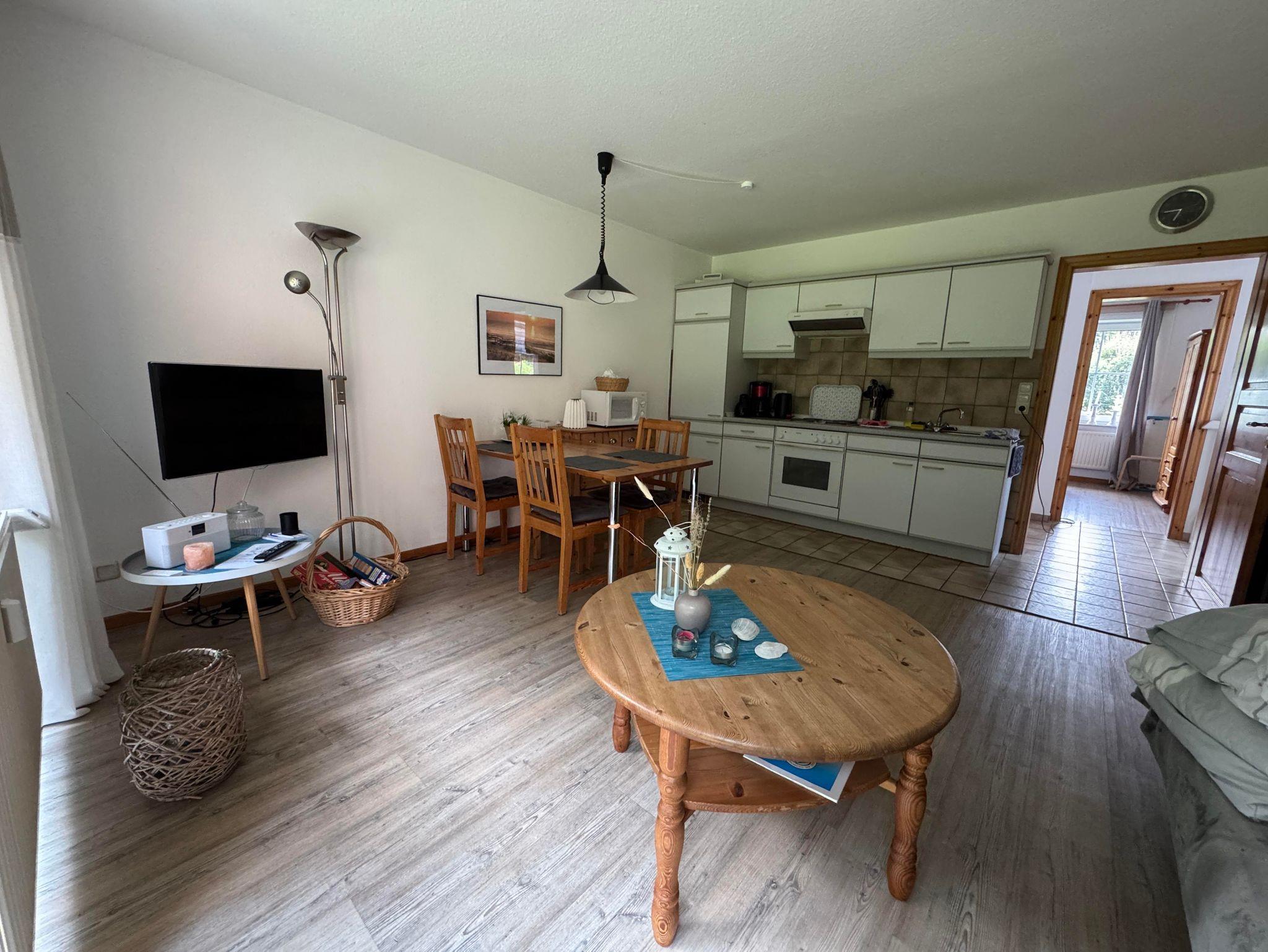 Sie ist ausgestattet mit einem Wohnraum mit integrierter Küchenzeile, einem Sofa das auch als Schlafsofa genutzt werden kann und einem Essplatz.