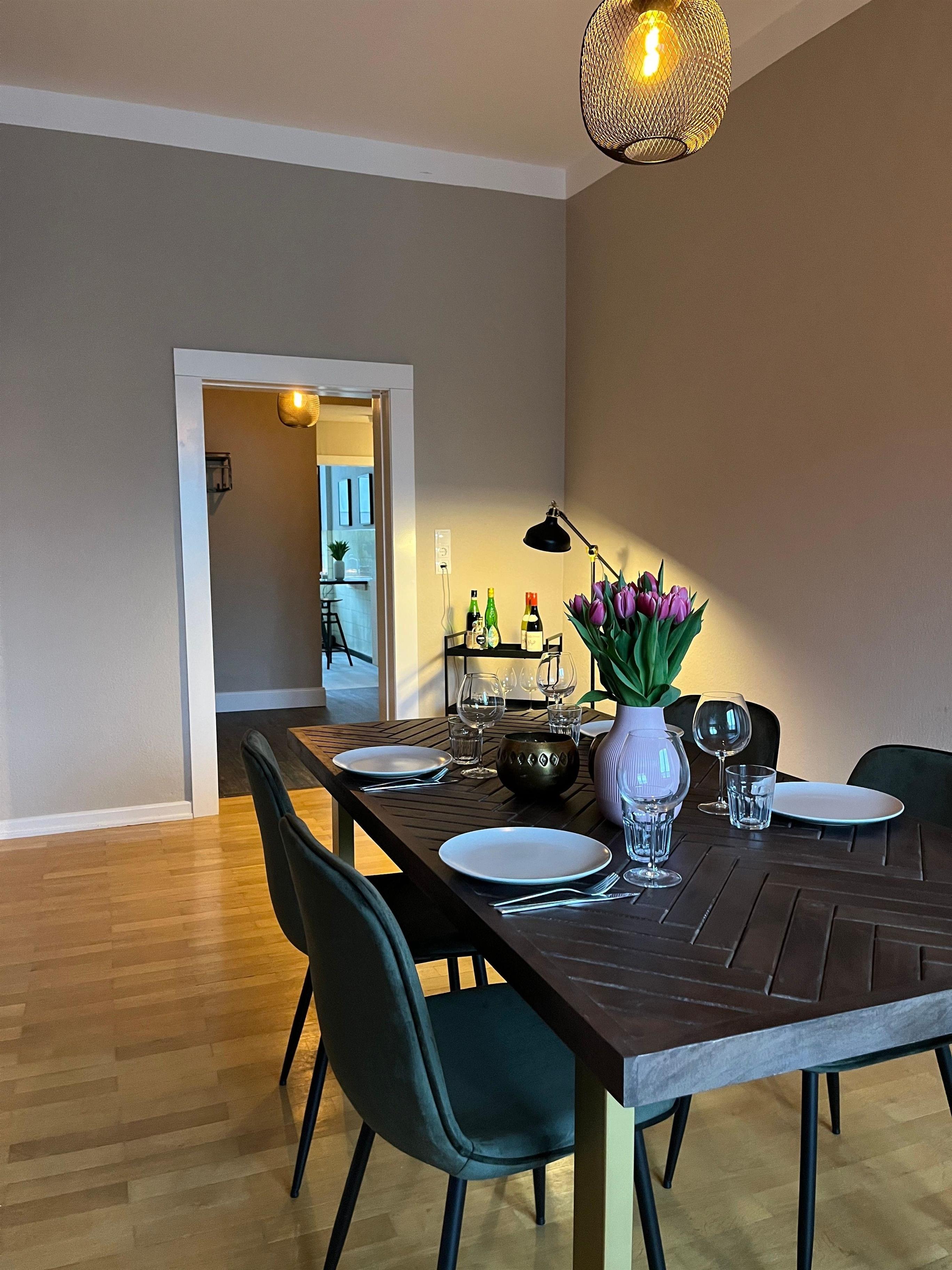 Hanna´s Place bietet auf 127 qm jede Menge Raum, um sich wohl zu fühlen. Ob mit der Familie oder den Freunden kannst Du es Dir hier gut gehen lassen. Zwei Schlafzimmer, ein Bad mit Dusche und Badewanne sowie eine weitere Toilette, eine Küche sowie das Ess- und Wohnzimmer stehen zur Verfügung. Darüber hinaus gehört zum Appartment eine großzügige Terrasse, die sowohl Morgens als Abends in der Sonne liegt. Die Wohnung ist großzügig und gemütlich. Die warmen Farben sorgen sofort für Wohlfühlstimmung. In der vollausgestatteten Küche macht Kochen Spaß. Kühlschrank, Backofen, Herd, Kaffeemaschine und Wasserkocher sind vorhanden. Ebenso werden Bettwäsche, Handtücher und Küchentücher für den Aufenthalt zur Verfügung gestellt. Die Wohnung teilt sich auf in ein großes Wohnzimmer mit Fernsehen, ein separates Esszimmer, eine Küche mit Sitzmöglichkeit, eine großer Balkon mit Sitzmöbeln, ein Schlafzimmer mit einem Doppelbett, einem weiteren Schlafzimmer mit zwei Einzelbetten, ein Bad mit Dusche und Badewanne sowie eine weitere separate Toilette. In großen Einbauschränken gibt es jede Menge Platz für Gepäck und Kleidung. WLAN ist vorhanden. Im Erdgeschoss des Hauses befindet sich ein Fitness Studio, dass von den Gästen der Wohnung kostenfrei genutzt werden kann.