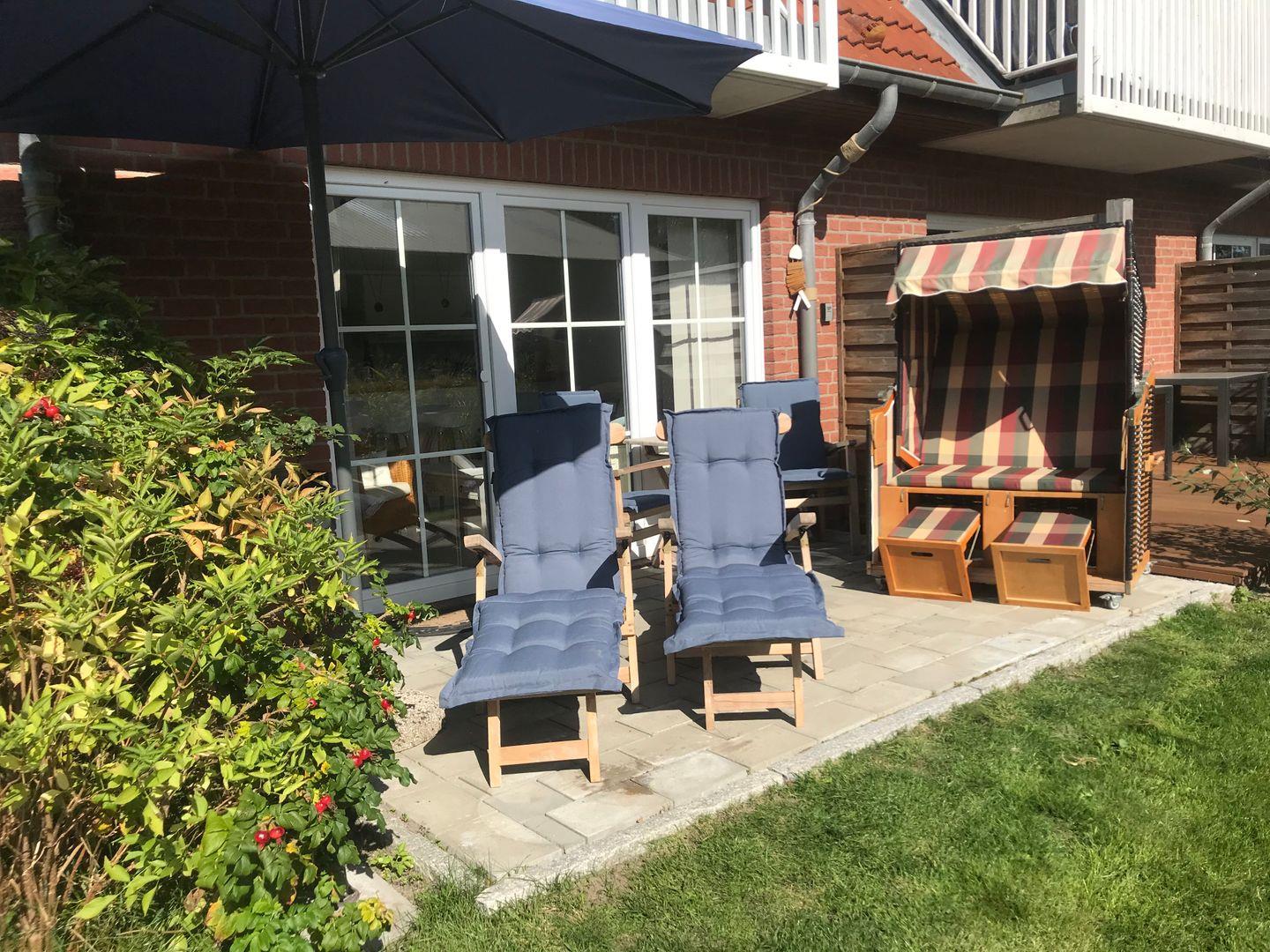 Der Eingang zur Wohnung öffnet sich zu einer großen Rasenfläche, die als Liege- oder Spielwiese genutzt werden kann. Im Süden begrenzt ein typischer Eiderstedter Wassergraben das Grundstück, das ansonsten offen gestaltet und nicht eingezäunt ist. Hier können Sie in Ruhe entspannen und die Natur genießen. Die Wohnung ist der ideale Ausgangspunkt für lange Spaziergänge mit Ihrem Hund oder Fahrradtouren ans Meer.