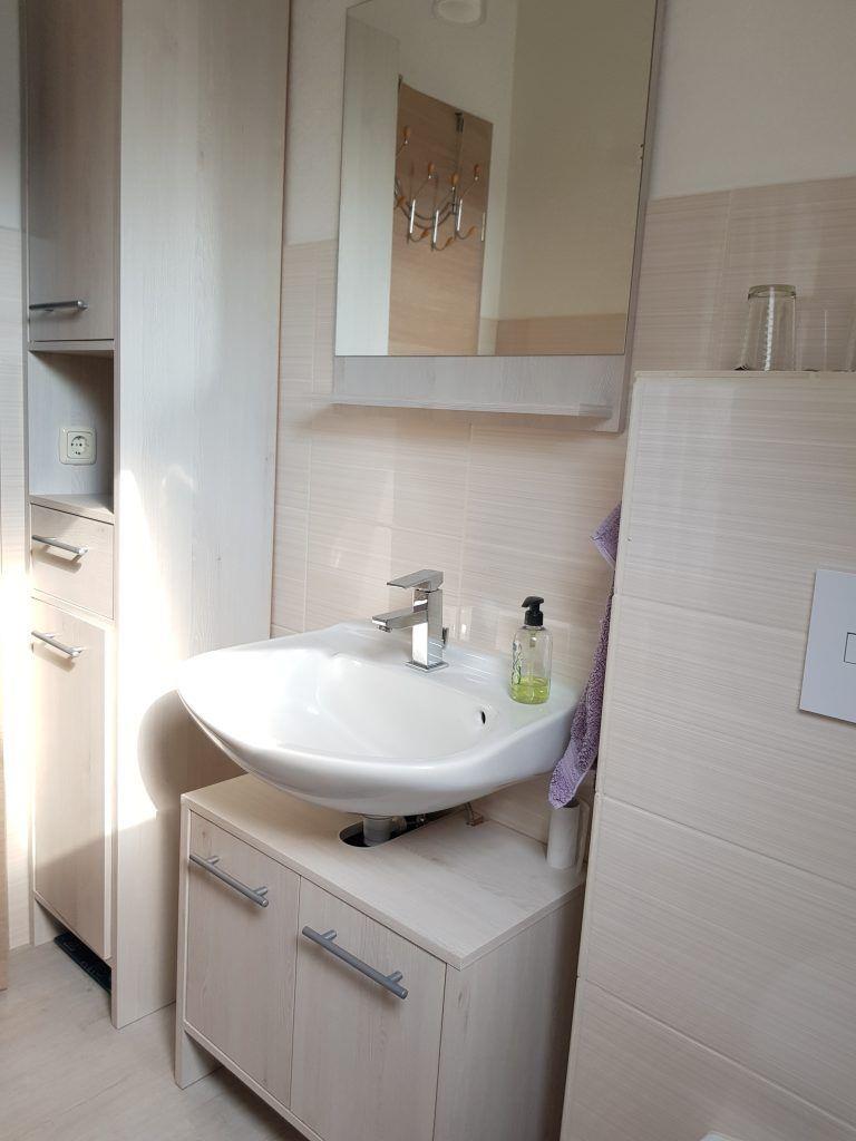 In der Küche befinden sich Geschirrspülmaschine und Mikrowelle. Der Kühlschrank mit Gefriermöglichkeit befindet sich in einem separaten Raum neben dem Wohnbereich. Dieser Raum dient auch als Abstellmöglichkeit für Ihr Gepäck, Staubsauger usw..