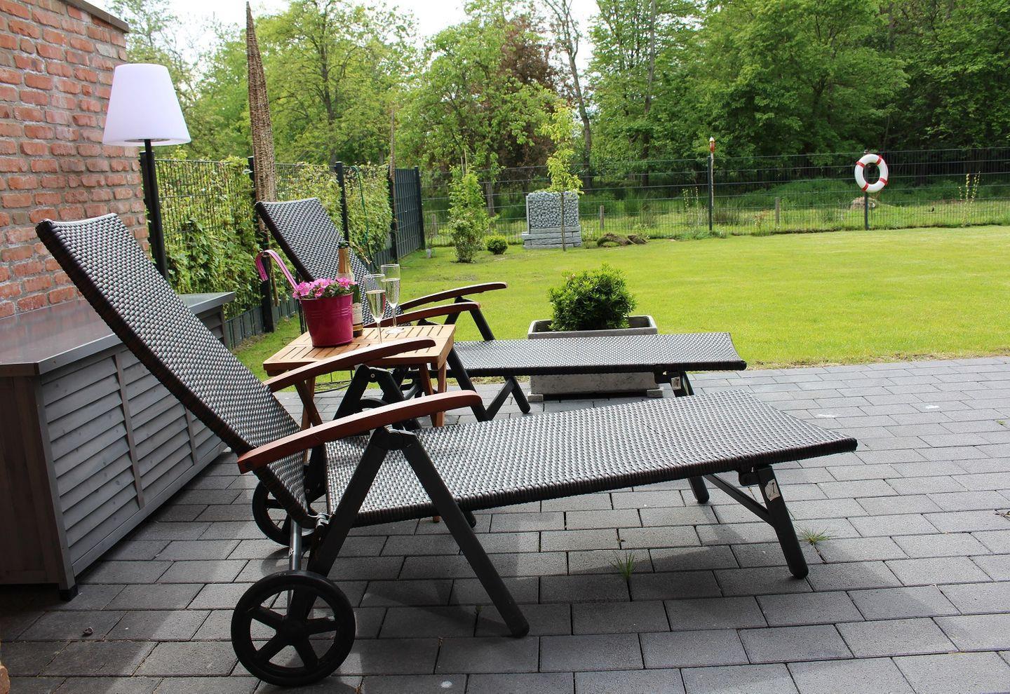 Terrasse möbliert mit Strandkorb, 2 Sitzgarnituren, Liegen, elektr. Grill, eingezäunter Garten, Schaukel, Carport mit abschließbarem Abstellraum, in dem Fahrräder untergestellt werden können.