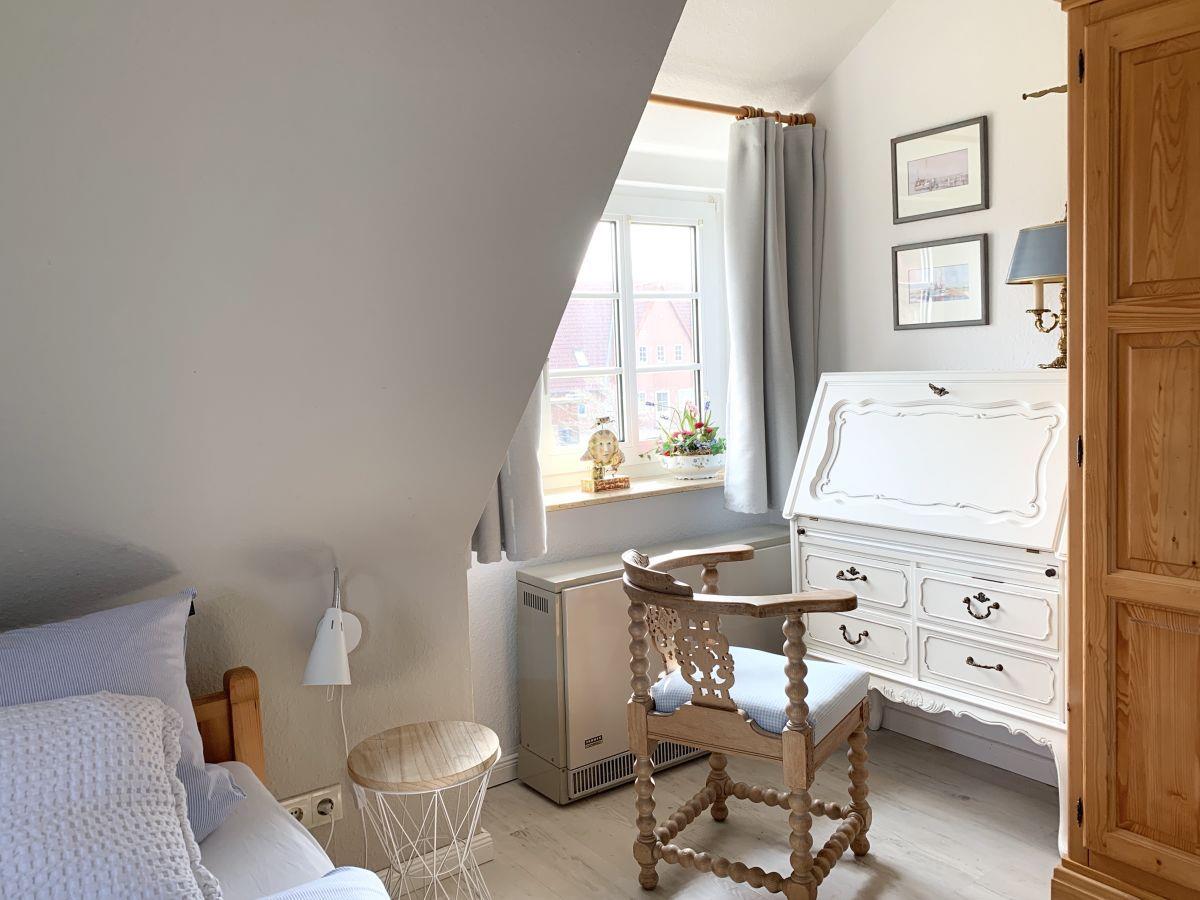 Schlafzimmer mit Doppelbett (180 x 200 cm), Kleiderschrank und Sekretär. Fenster mit Verdunklungsplissee und Vorhang.