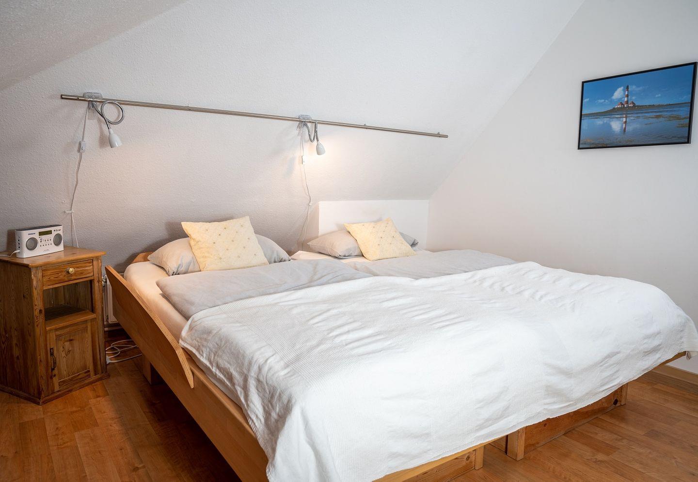 Schlafzimmer mit Doppelbett, Kleiderschrank und Nachttischen.