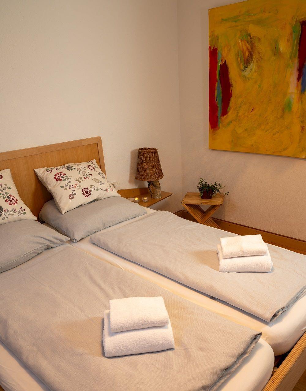 Schlafzimmer mit zwei Einzelbetten, Schlafcouch, Kommode, Schrank und Nachttischen, Satellit-Fernseher und auf Wunsch mit zusätzlichem Kinderbett.