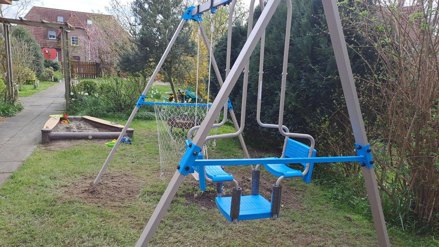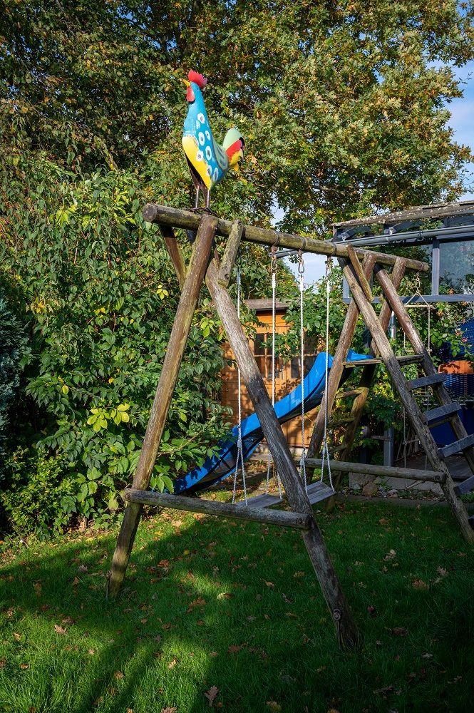 Schaukel und Rutsche, Sandkasten, Parkplatz auf dem Grundstück.