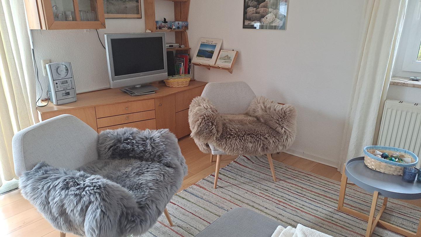 Wohnzimmer mit 3er-Sofa und drei Sesseln, Esstisch für sechs Personen, ein Kinderhochstuhl, Satellit-Fernseher, Stereoanlage mit CD-Player.