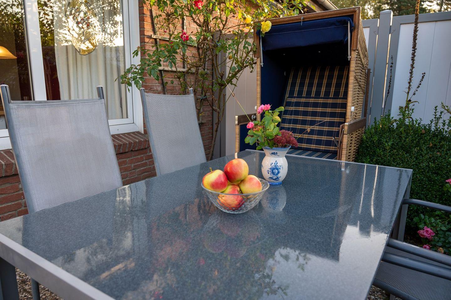 2 Terrassen: mit Glas überdachte Veranda im hinteren Garten mit Blick auf den Spielbereich und eine Sonnenterrasse mit Markise im vorderen Garten mit Zugang aus dem Wohnzimmer, Strandkorb (im Sommer).