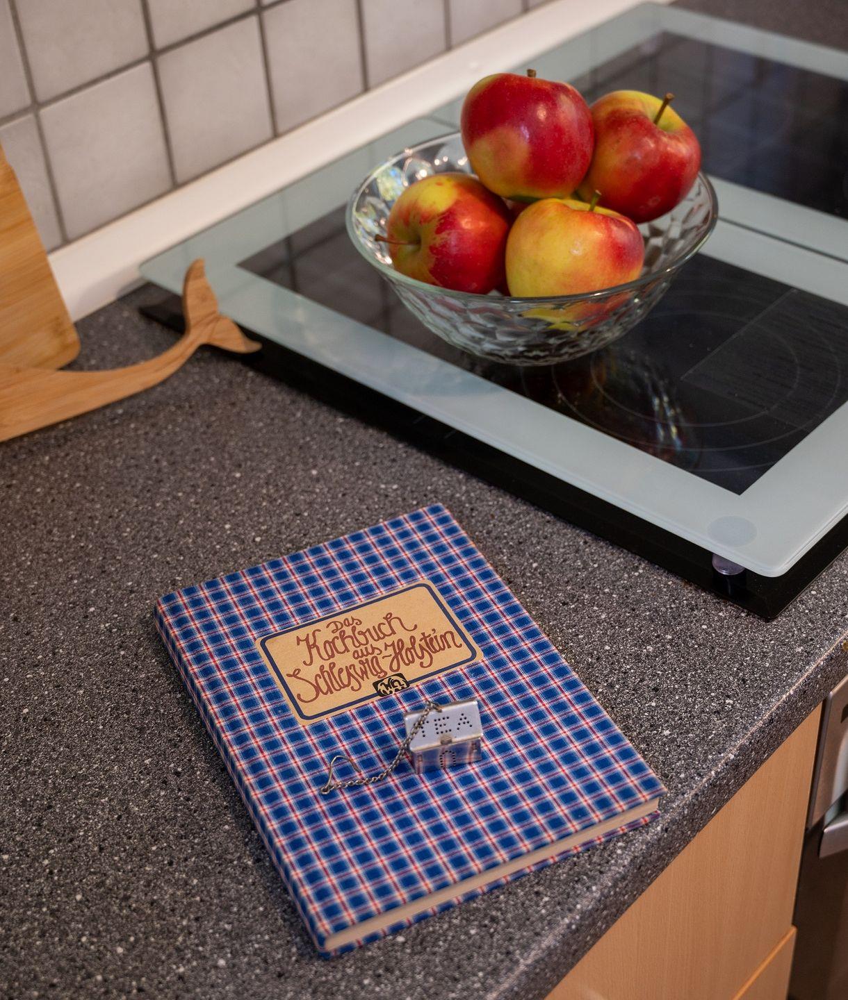 Küche mit Herd, Ceranfeld vier Kochstellen, Backofen, Dunstabzugshaube, Mikrowelle, Geschirrspüler, Kühlschrank mit Tiefkühlfach, Kaffeemaschine u. a. E-Geräten.
