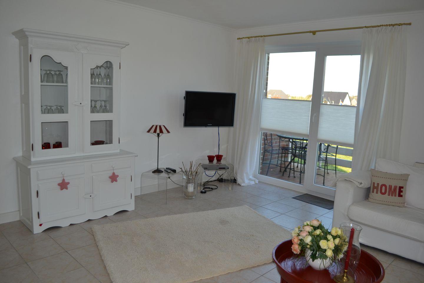 Wohnraum mit Sofagarnitur, SAT-TV, DVD- Player, CD-Anlage, möblierter Balkon
