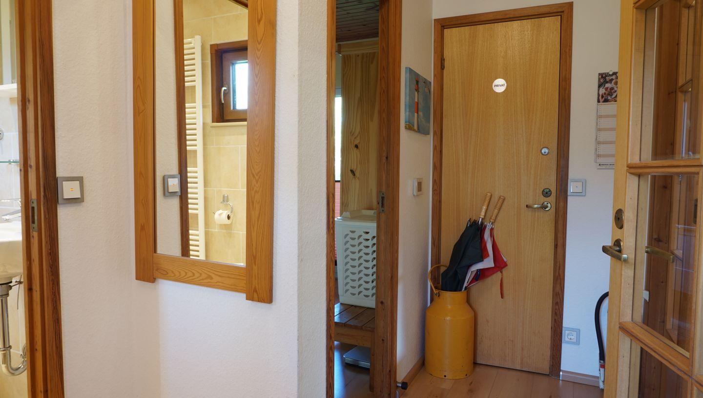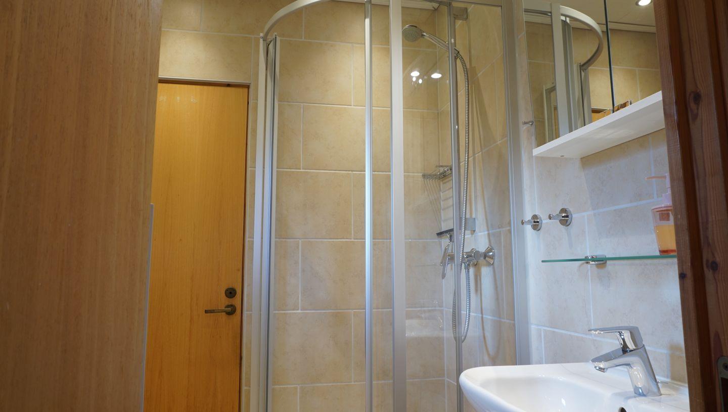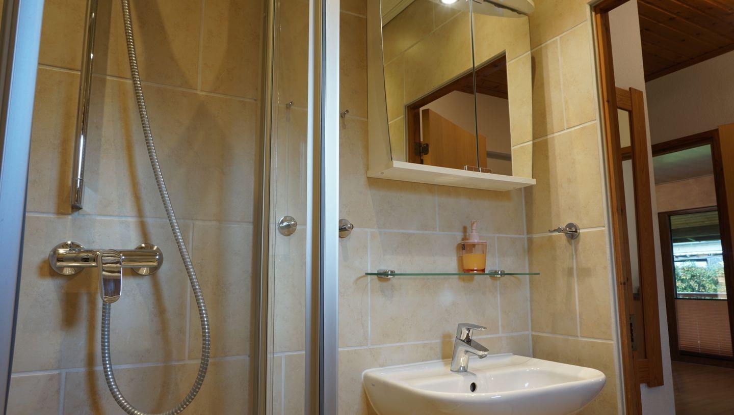 Das Duschbad ist mit einem Waschbecken, Wc, Spiegel und einem Fön ausgestattet.