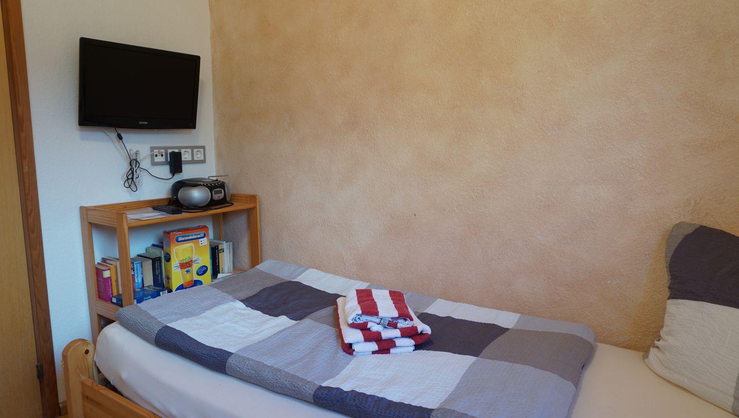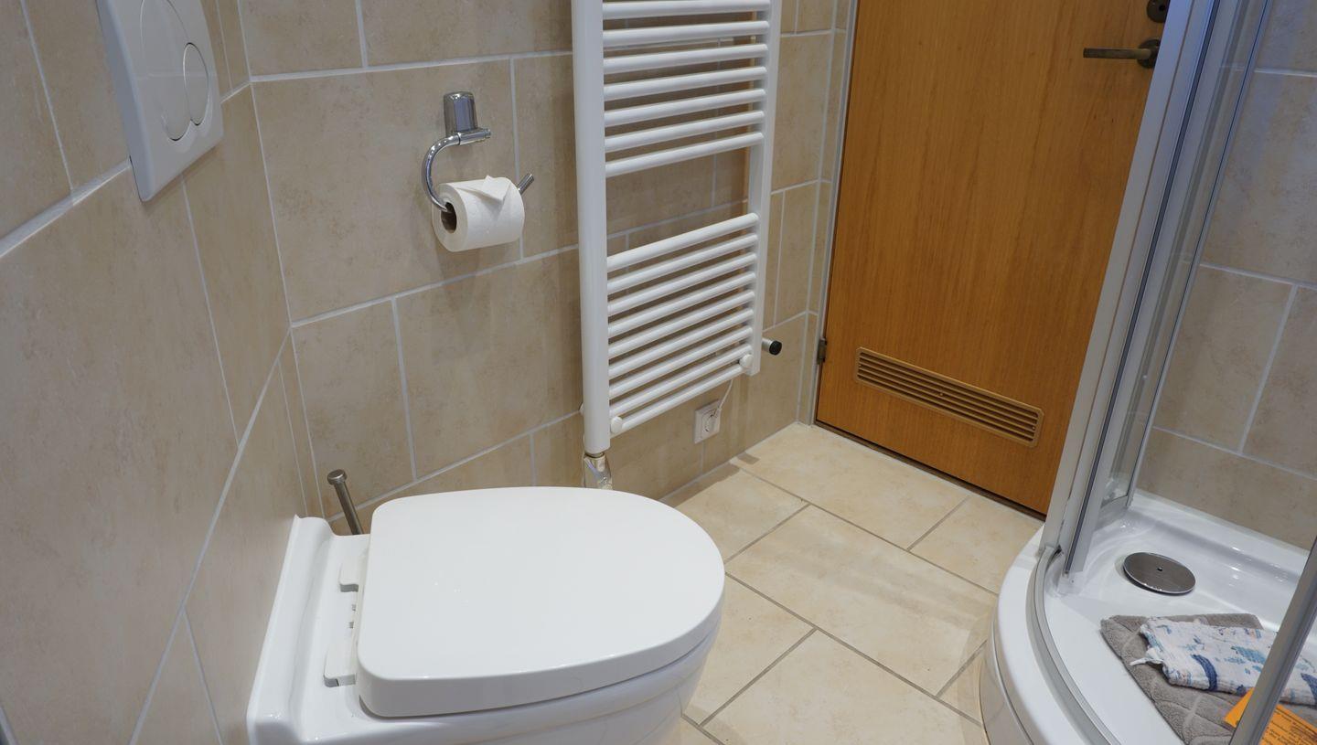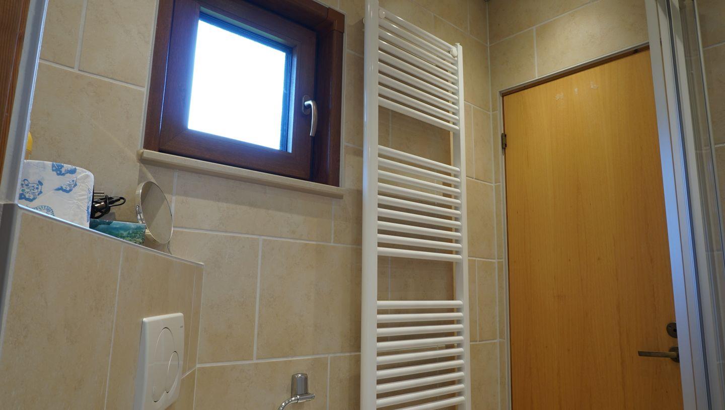 Das Duschbad ist mit einem Waschbecken, Wc, Spiegel und einem Fön ausgestattet.