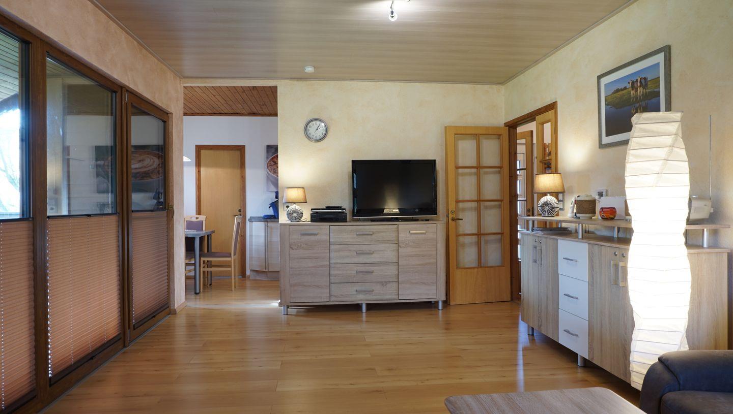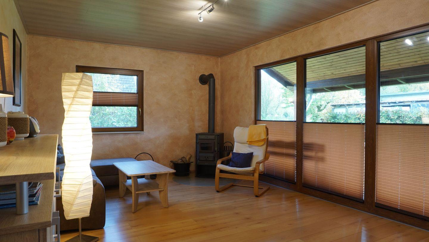 Im offenen Wohnbereich lädt eine gemütliche Sofaecke mit TV zum Entspannen ein. Ein Kaminofen sorgt für wohlige Wärme an kühleren Tagen. Für diejenigen, die auch im Urlaub arbeiten müssen, steht ein Schreibtisch mit Internetzugang bereit. Die offene Küche ist komplett ausgestattet mit Kühlschrank, Gefrierfach, Ceranfeld, Backofen, Geschirrspülmaschine, Kaffeefiltermaschine, Mikrowelle, Wasserkocher und Toaster. Am kleinen Esstisch in der Küche können Sie Ihre Mahlzeiten genießen.