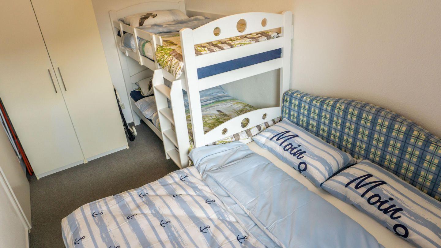 Das separate Schlafzimmer bietet ausreichend Stauraum mit 4 Schlafplätzen. Ein Doppelbett ( 190x160cm) und einem Etagenbett (2x 90x190cm) . Das Etagenbett ist auch für Erwachsene mit ca, 1,80m Größe geeignet vor allem aber für Kinder. Die offene Küche ist vollständig ausgestattet mit Ceranherd, Backofen, Mikrowelle, Kühlschrank mit Gefrierfach, Kaffeemaschine, Wasserkocher und Toaster. Ein Esstisch sorgt für gemeinsame Mahlzeiten in entspannter Atmosphäre. Das Badezimmer verfügt über eine annähernd ebenerdige Dusche, Waschbecken, WC und ein Fenster. Alle Fenster sind mit Sichtschutz und Fliegengittern versehen, sodass Sie auch im Sommer ungestört schlafen können.