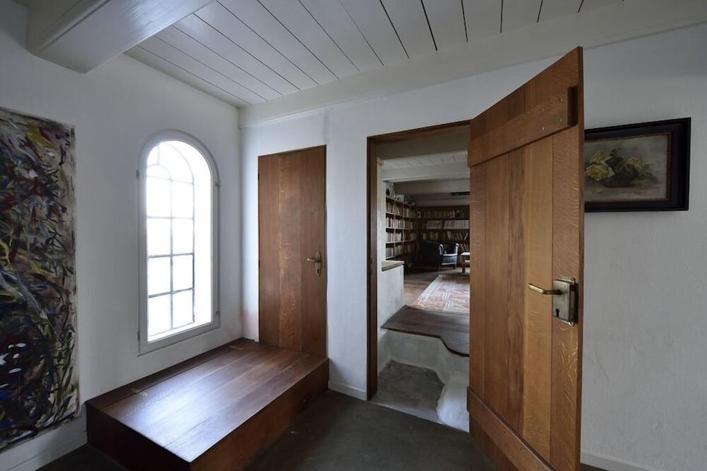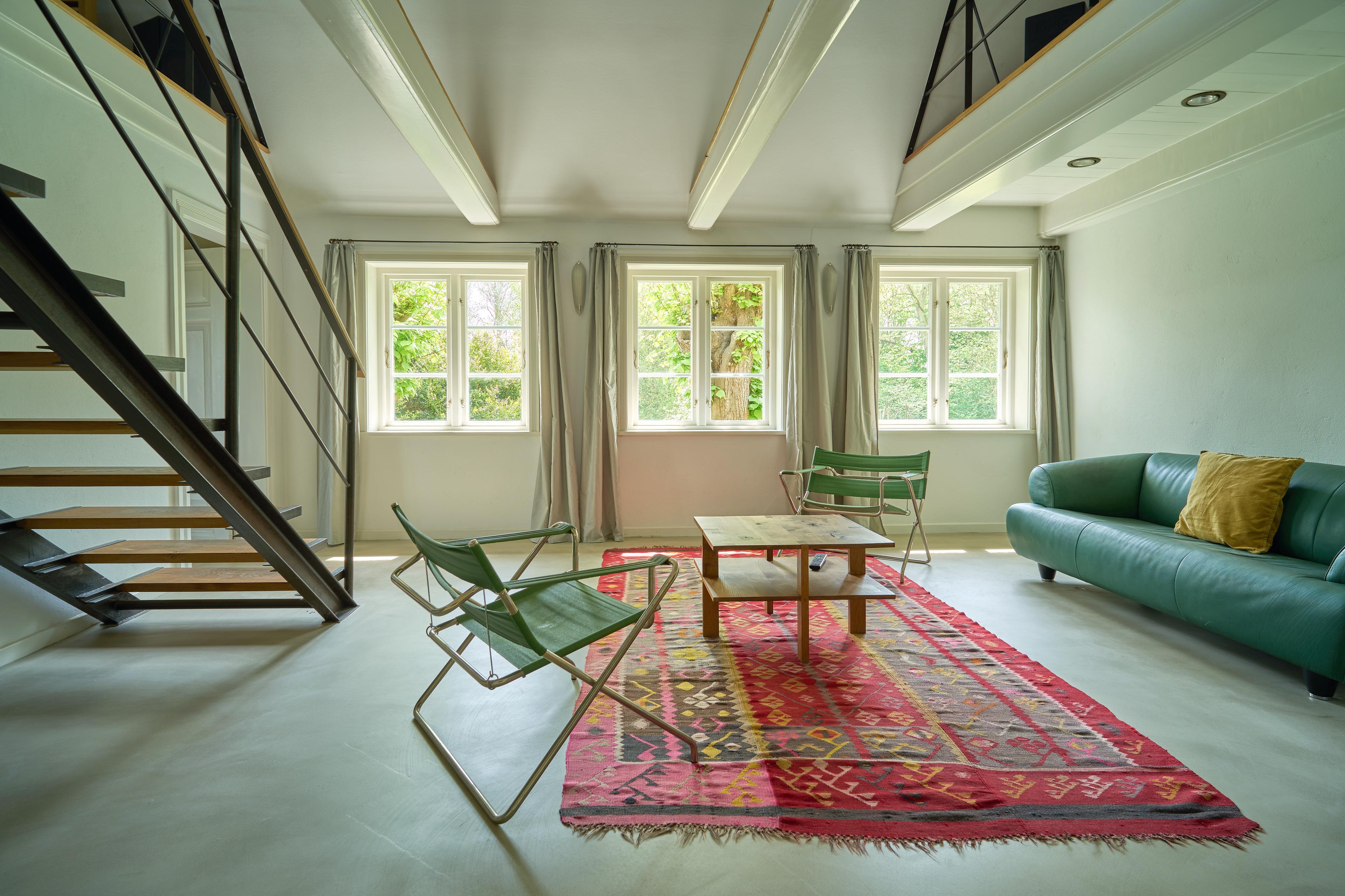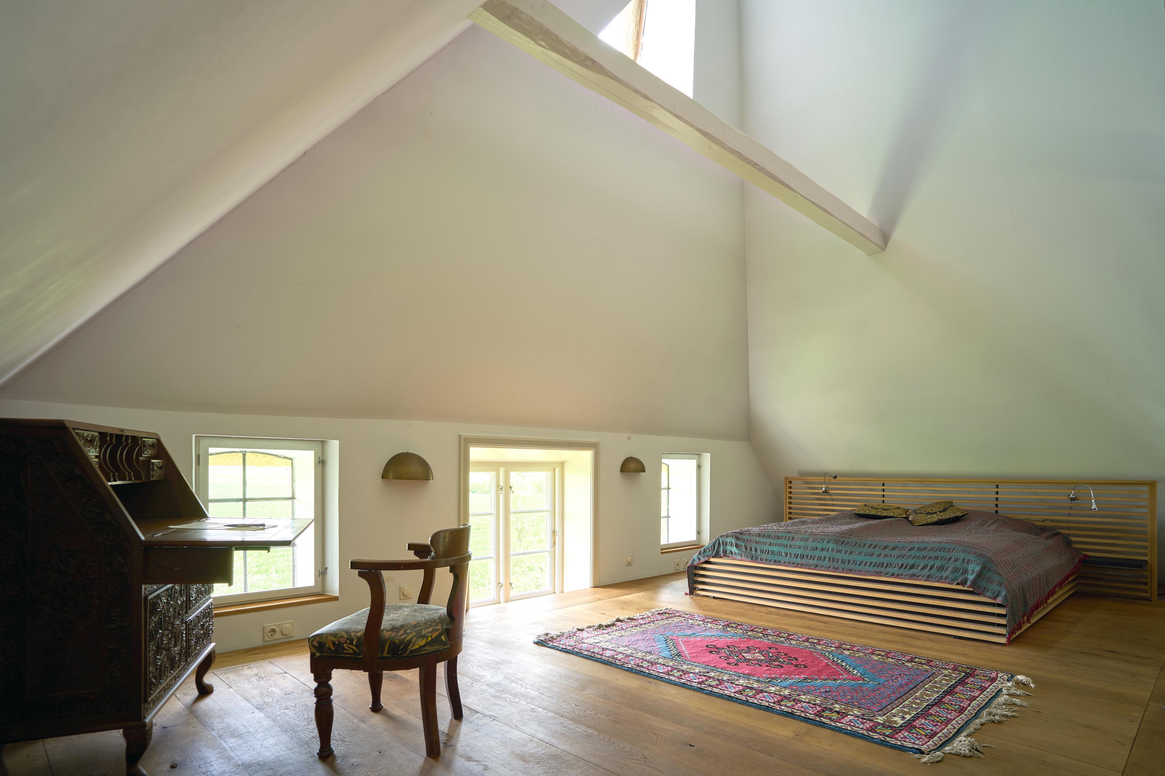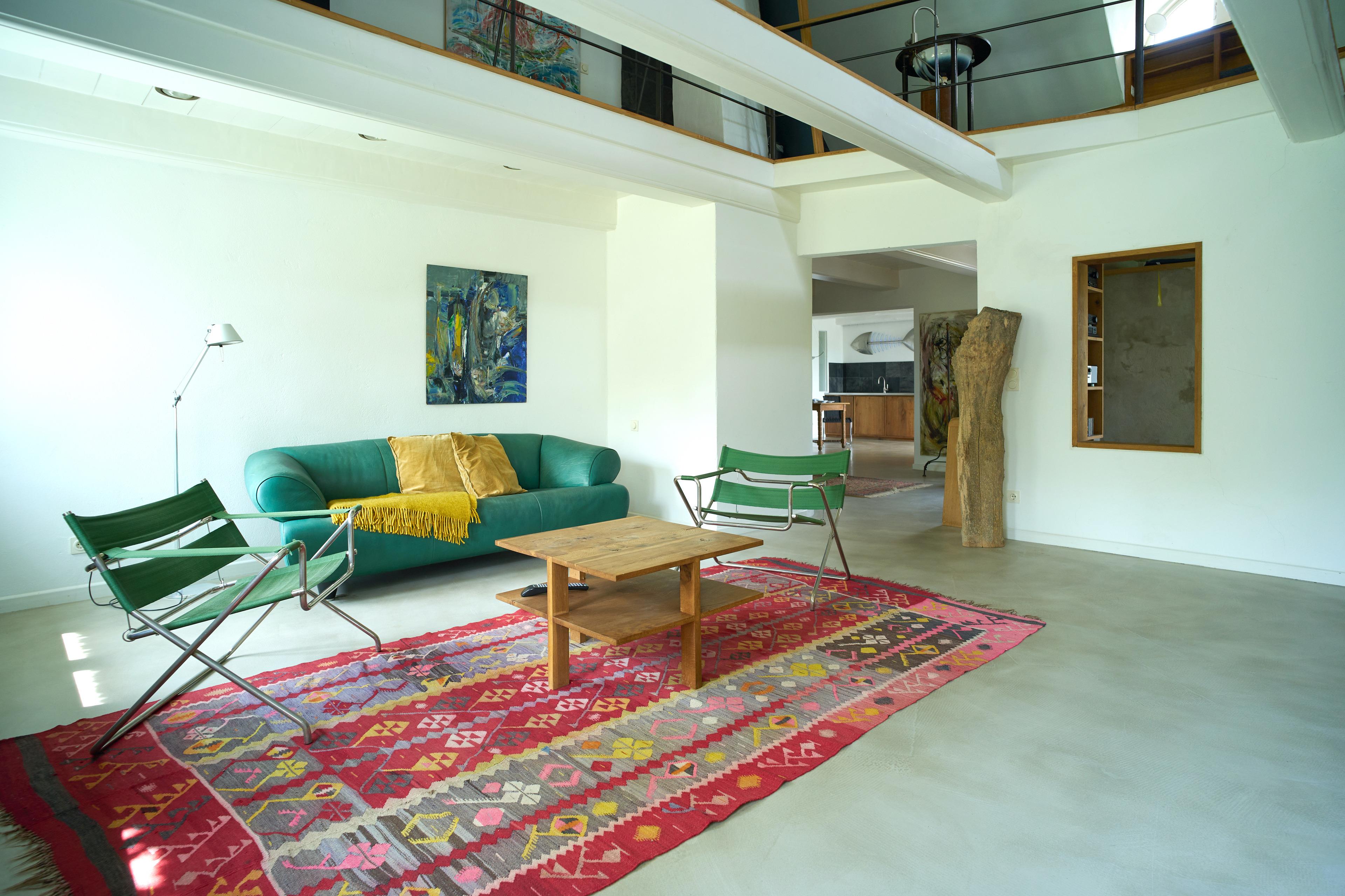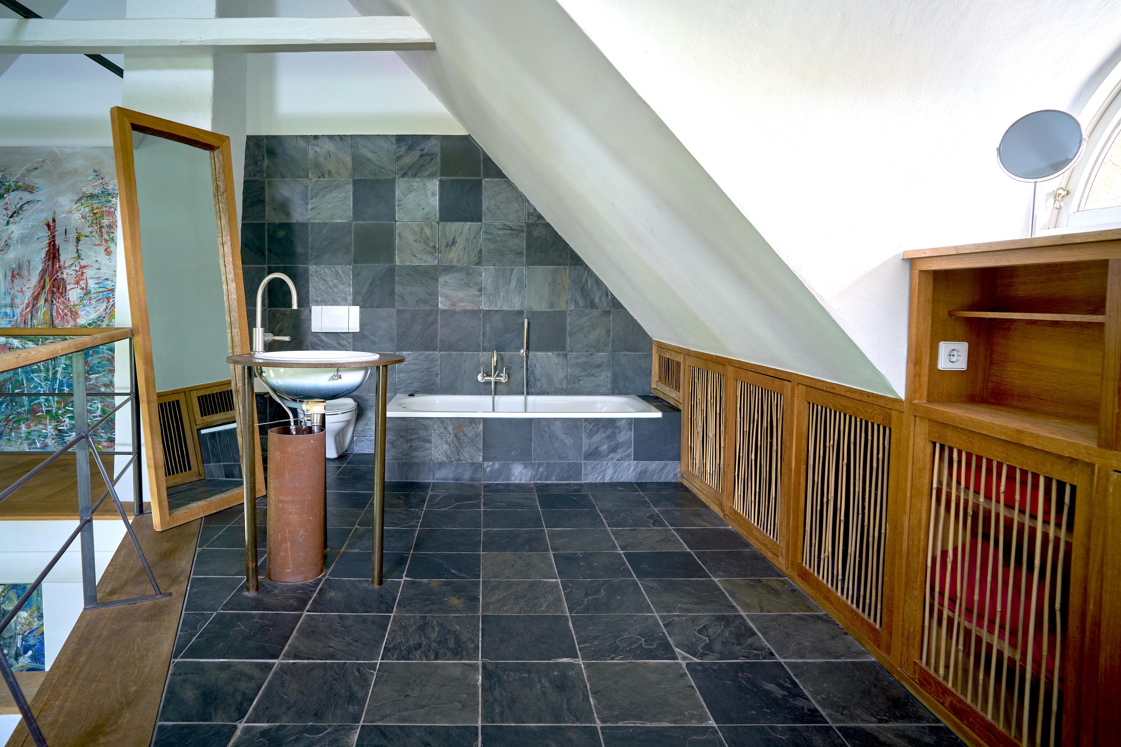 Die zu vermietende Haushälfte ist modern und individuell eingerichtet. Sie betreten das Haus über eine geräumige Küche, die in einen bis zum First geöffneten Wohnbereich mit umlaufender Galerie übergeht. In dieser loftähnlichen Architektur befindet sich oben der Schlafbereich mit frei zugänglichem mit schwarzem Schiefer gefliesten Bad. Neben Küche und Wohnbereich gibt es unten noch eine gemütliche, reichhaltig ausgestattete Bibliothek, mit ausgewählter Literatur und Kunst, sowie ein kleines Schlaf und Ankleidezimmer und ein separates Gäste-WC. Es wurden nur echte Baumaterialien wie massive Eiche,Schiefer , Messing und Stahl verwendet. Viele der Designer Möbel sind vom Hausherrn entworfen und in Handarbeit hergestellt.