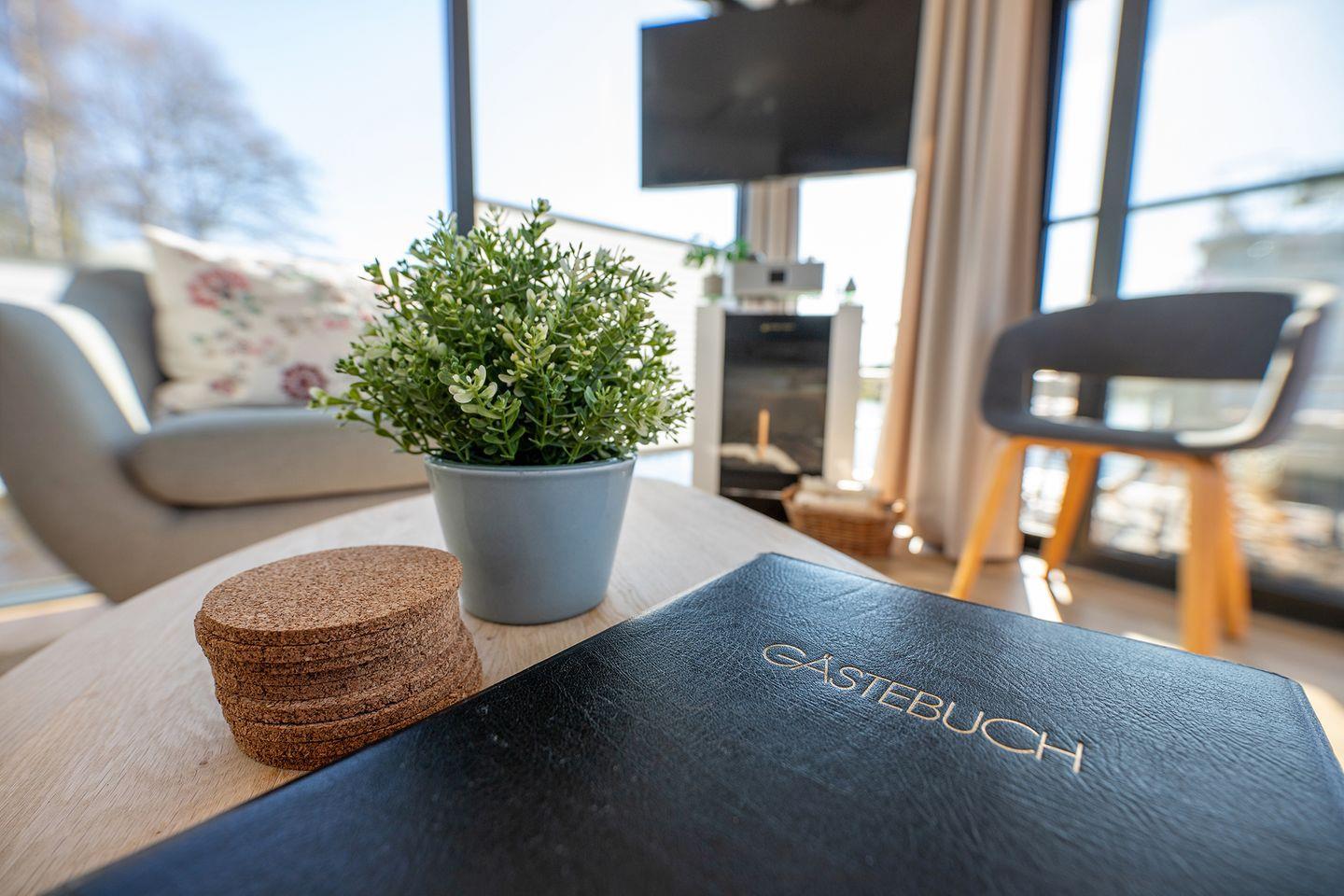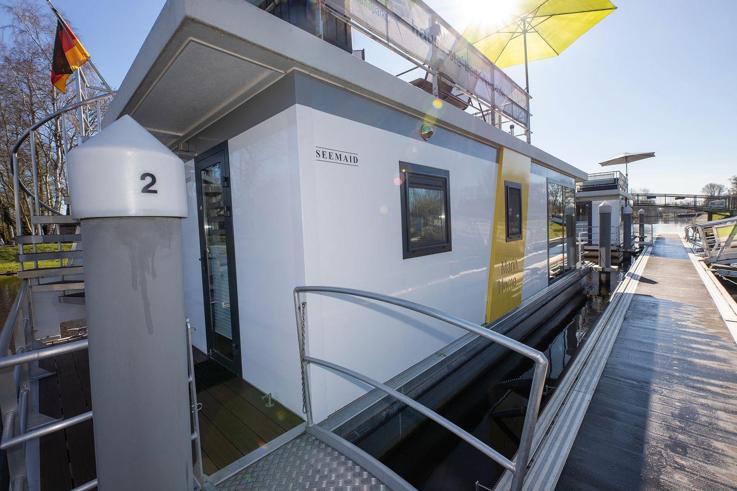Gemütliches Hausboot in der Marina Bad Bederkesa mit Kamin, Dachterrasse und Seeblick für entspannte Tage auf dem Wasser.