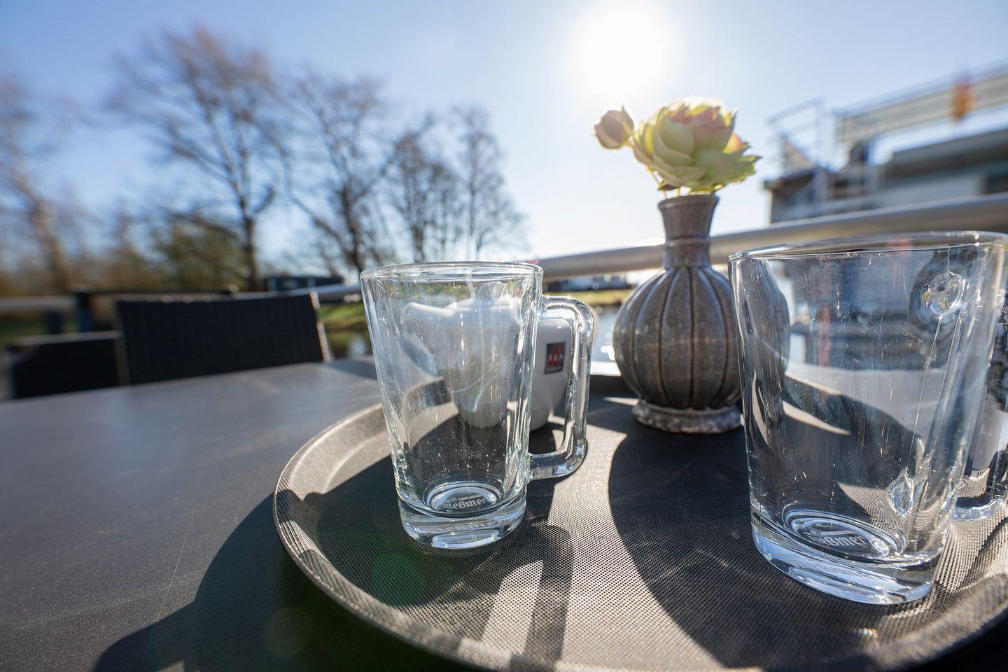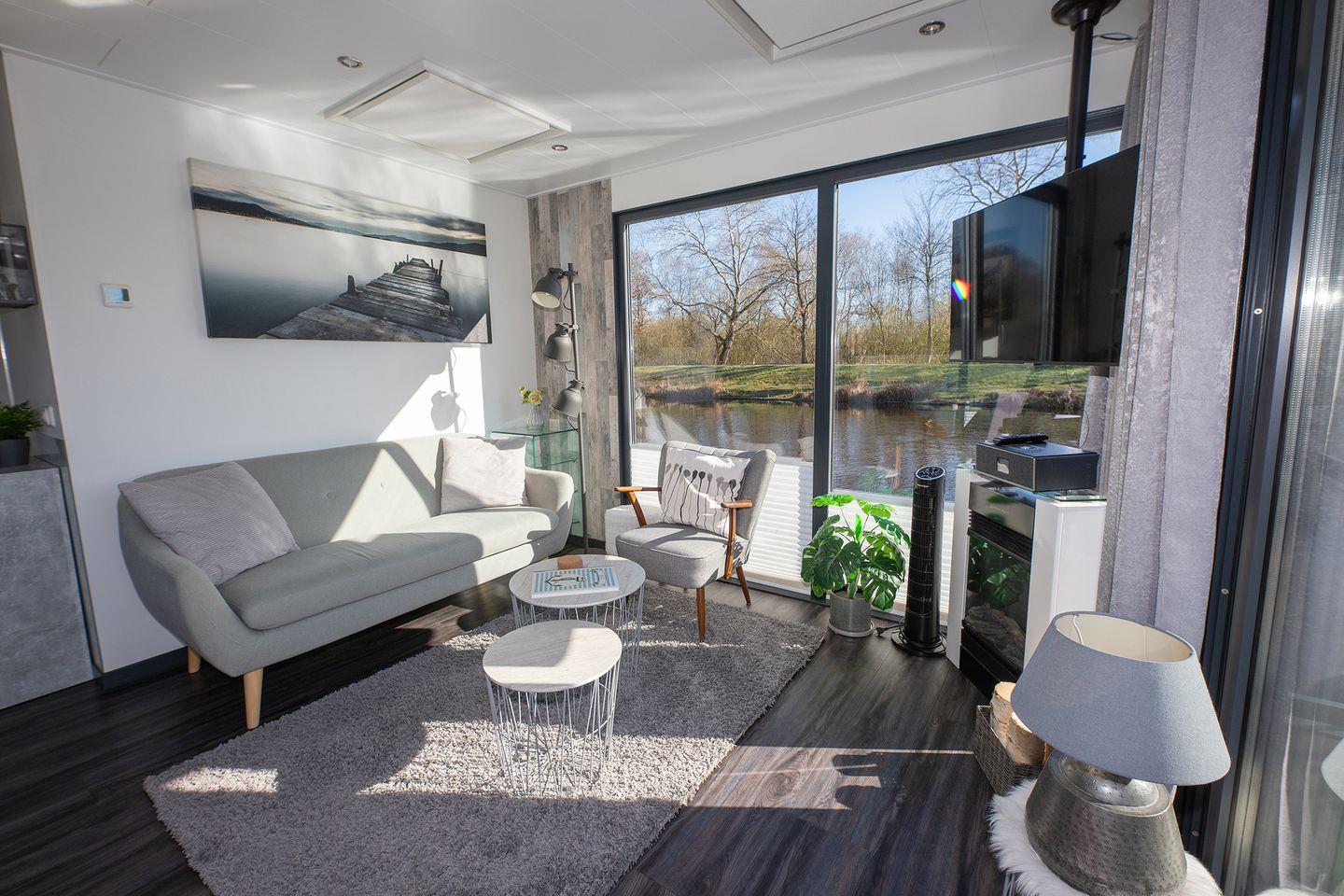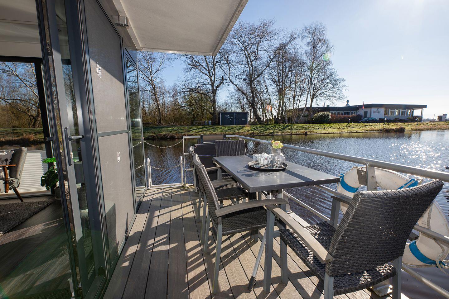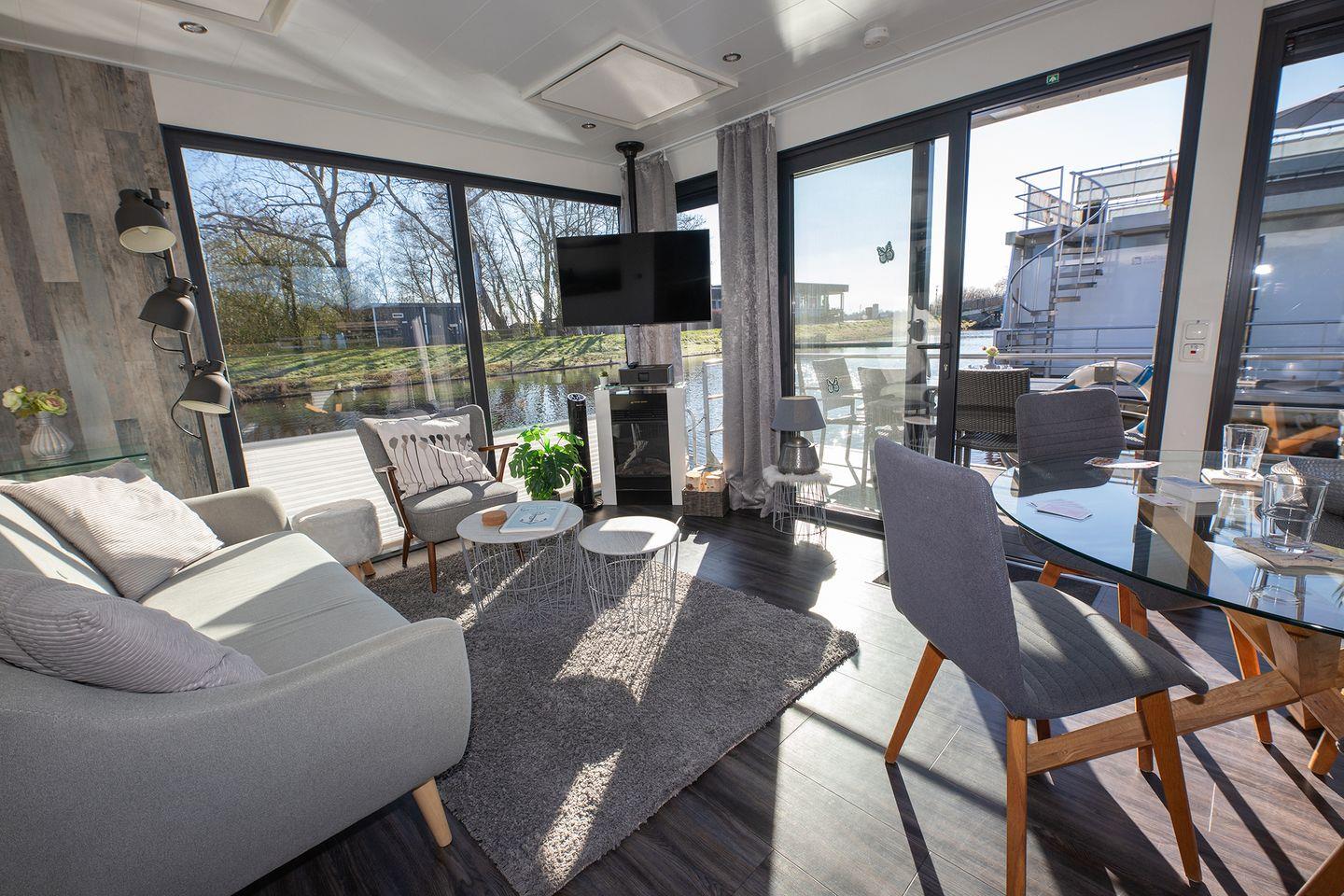 Komfortables Hausboot in Bad Bederkesa mit Seeblick, Kaminofen und großer Dachterrasse für entspannte Tage auf dem Wasser.