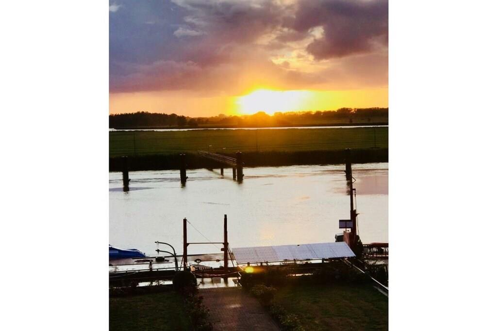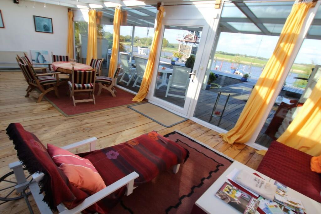 Die Atelierwohnung erstreckt sich auf ca. 165 qm. Sie haben eine überdachte Terrasse und Zugang zur großen Dachterrasse. Im Wintergarten und auf der Terrasse haben Sie einen herrlichen Blick über die Flusslandschaft. Sie haben eine offene Küche mit Bar und einen großzügigen Wohn-und Essraum, zwei gemütliche Doppelzimmer und ein wunderschönes Bad mit einer Badewanne mit Himmelblick. Der ideale Ort zum Entspannen. Zusätzliche Schlafgelegenheit für 5. Person im Wohnraum. Die Ferienwohnung besticht durch ihren mediterranen Stil und vielen schönen Detail, wie echten Ölgemälden, Kerzenständern und einem Kamin für kuschelige Abende.