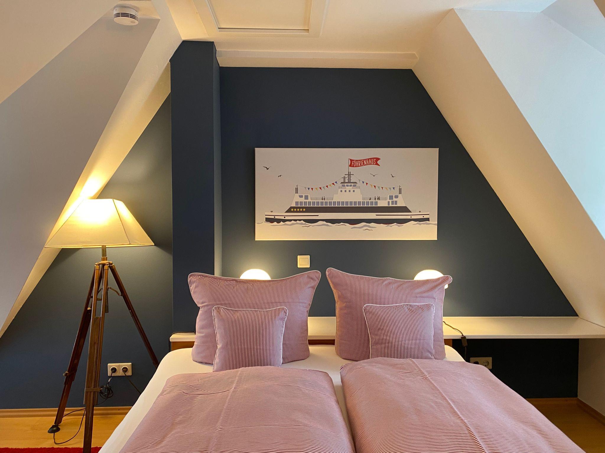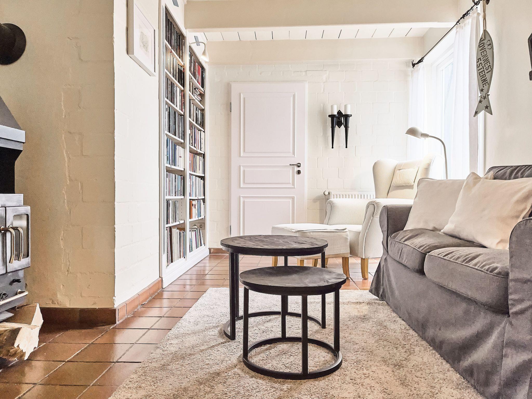 Auch dieses Haus haben wir mit viel Liebe zum Detail eingerichtet: der Wohnraum teilt sich auf in eine gemütliche Sitzrunde und einer Bibliothek mit einer großen Bücherauswahl und einem kuscheligen Kaminofen. Der große Esstisch grenzt an die voll ausgestattete Küche. Hier urlauben gerne befreundete Paare oder Familien mit Kindern, da sowohl ein Schlafraum mit Tageslichtbad im EG und die beiden anderen Schlafräume mit Tageslichtbad im OG untergebracht sind. Der außergewöhnliche Grundriss resultiert aus der optimalen Aufteilung des denkmalgeschützten Hauses. Den angrenzende Privatgarten können Sie durch den Wohnraum betreten, hier haben Sie auf überschaubarem Raum eine Terrasse mit Bestuhlung und eine mit dem eigenen Strandkorb. Im Garten stehen zusätzlich zwei Deckchairs zur Entspannung.