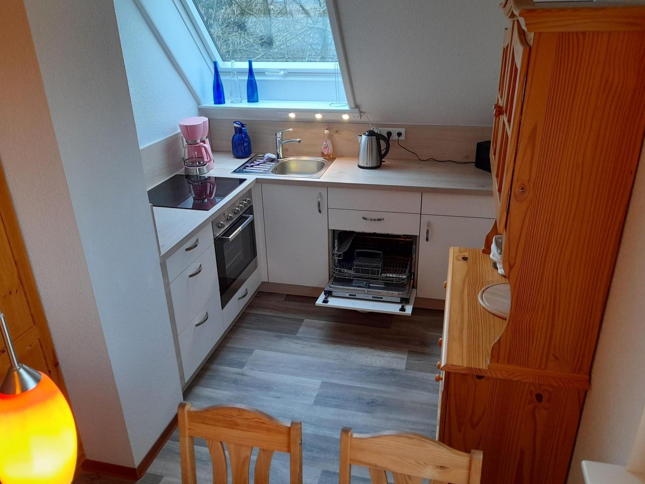 Diese Wohnung liegt im 1 OG.Ferienwohnung mit Wohnschlafraum , seperate Küche, Badezimmer mit Badewanne, Terassenplatz im Garten, Parkplatz