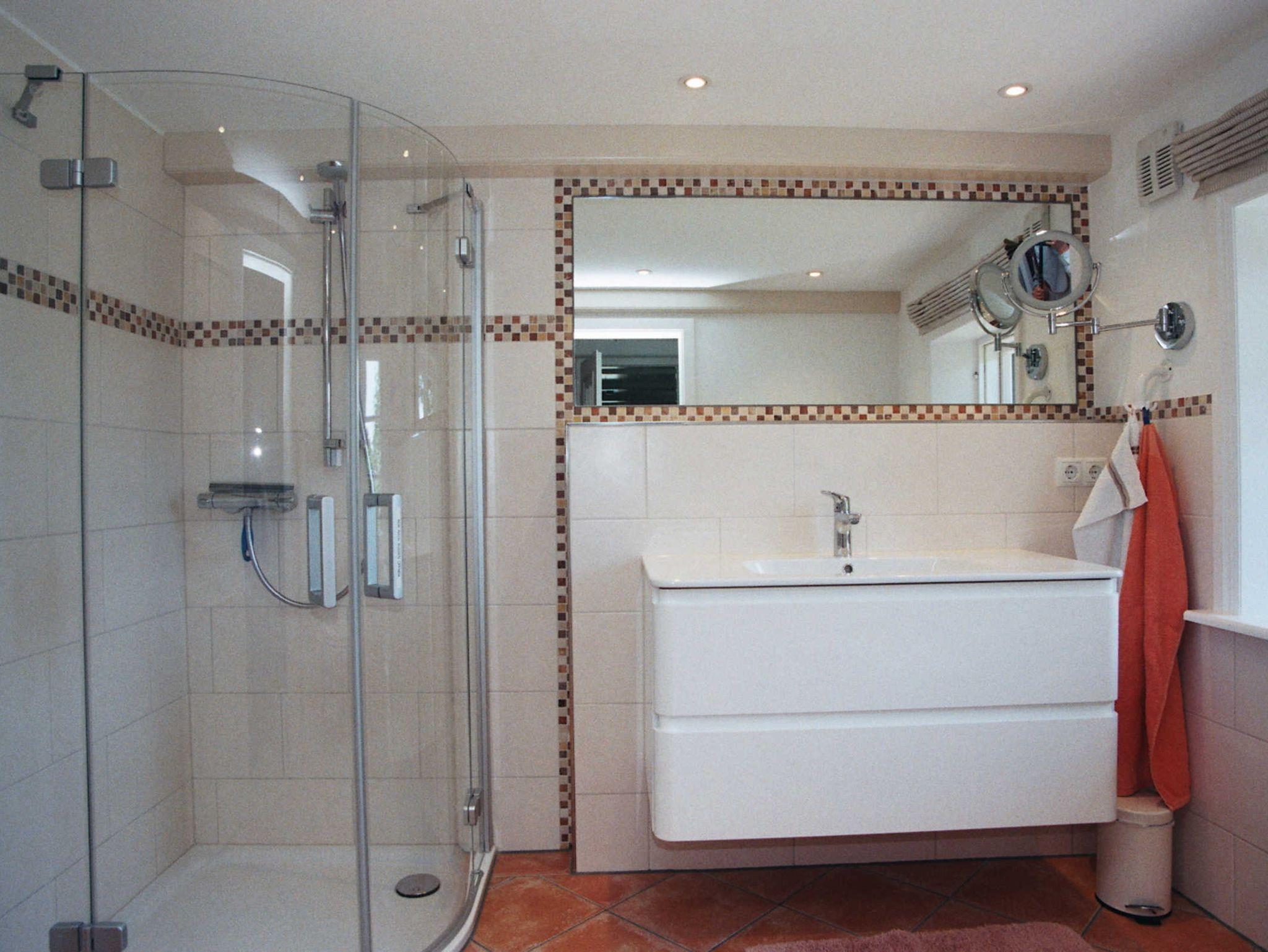 Sanitär: Föhn, Handtuchheizkörper, Schminkspiegel.