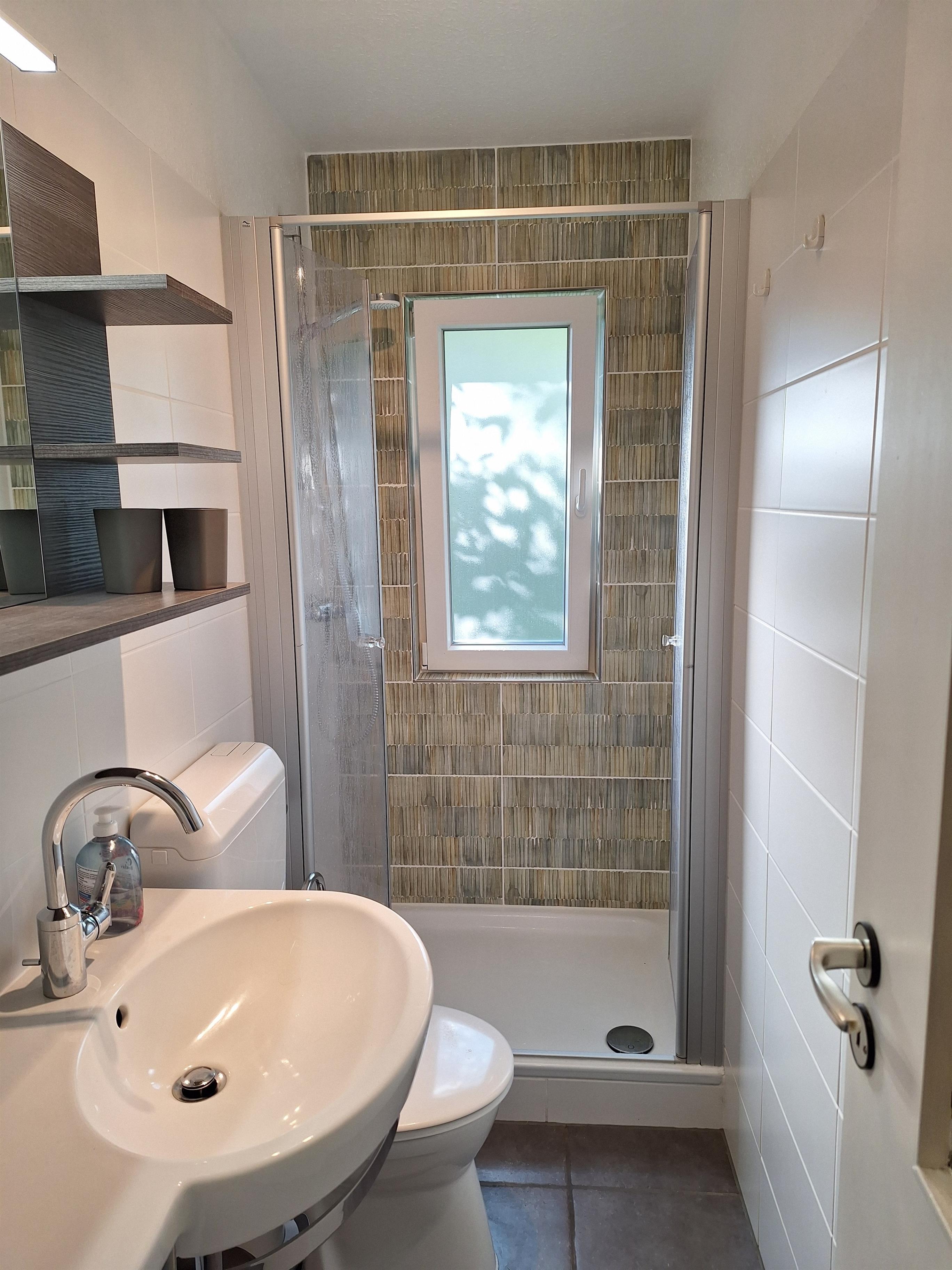 In dem gemütlichen, freistehenden Ferienhaus befinder sich alles auf einer Etage. Es verfügt über ein lichtdurchflutetes Wohnzimmer mit Ofen und Weinkühlschrank sowie direktem Terrassenzugang, eine separate Küche, ein Schlafzimmer mit Doppelbett (1,60 m breit) und ein Duschbad.