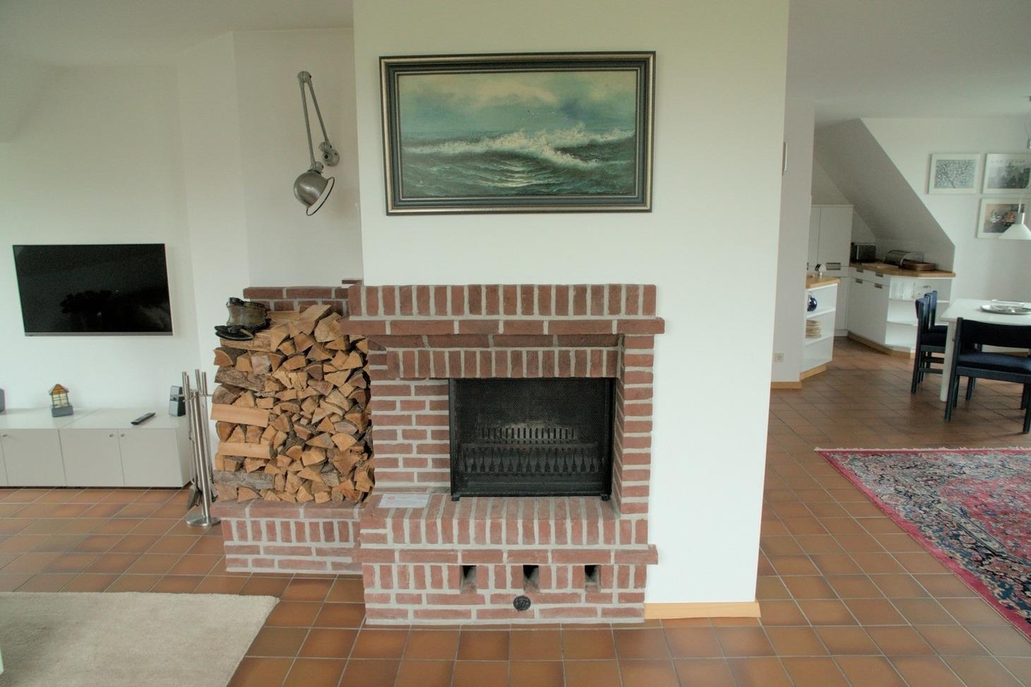 Das gemütliche Wohnzimmer mit hochwertigen Möbeln, offenem Kamin und kleiner Bibliothek lädt zu entspannten Abenden ein. Beginnen Sie den Tag mit einem Frühstück auf dem Südbalkon und beobachten Sie bei klarer Sicht die Fähren auf dem Meer. Die offene, voll ausgestattete Küche mit großem Essbereich ist ideal für gesellige Mahlzeiten.