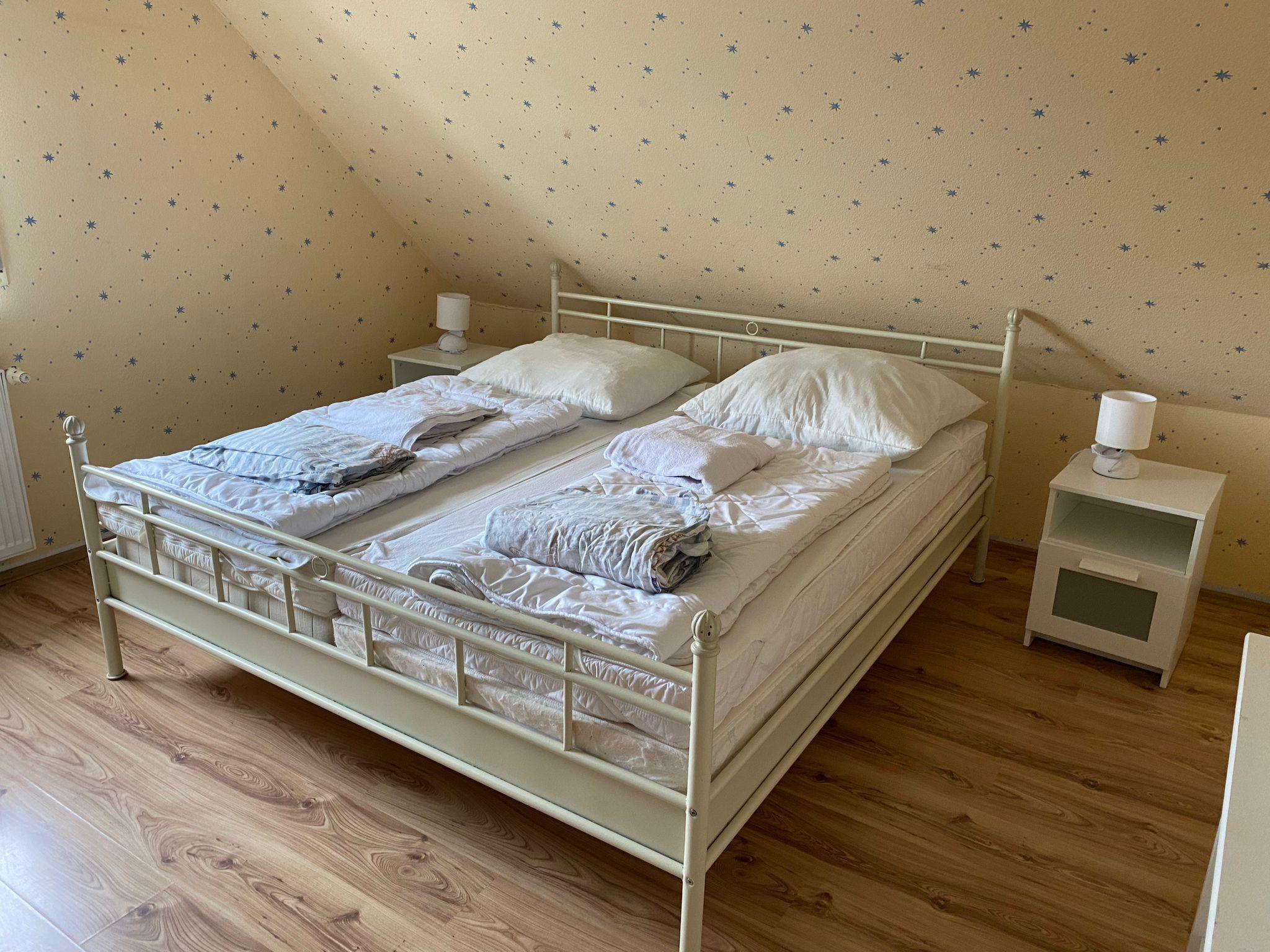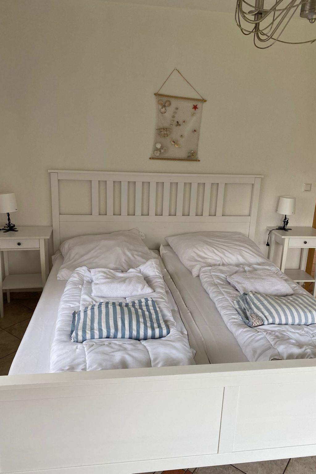 Im Erdgeschoss sind ein Badezimmer mit Dusche/WC, ein Schlafzimmer mit Doppelbett und ein Raum mit Waschmaschine, Trockner und Gefrierschrank vorhanden. Im OG befinden sich weitere 3 Schlafzimmer mit Doppelbetten. Bei einem dieser Schlafzimmer befindet sich neben dem Doppelbett ein IKEA Brimnes Ausziehbett für maximal 2 Personen. ein weiteres Bad mit Badewanne, Dusche, WC und 2 Waschbecken.