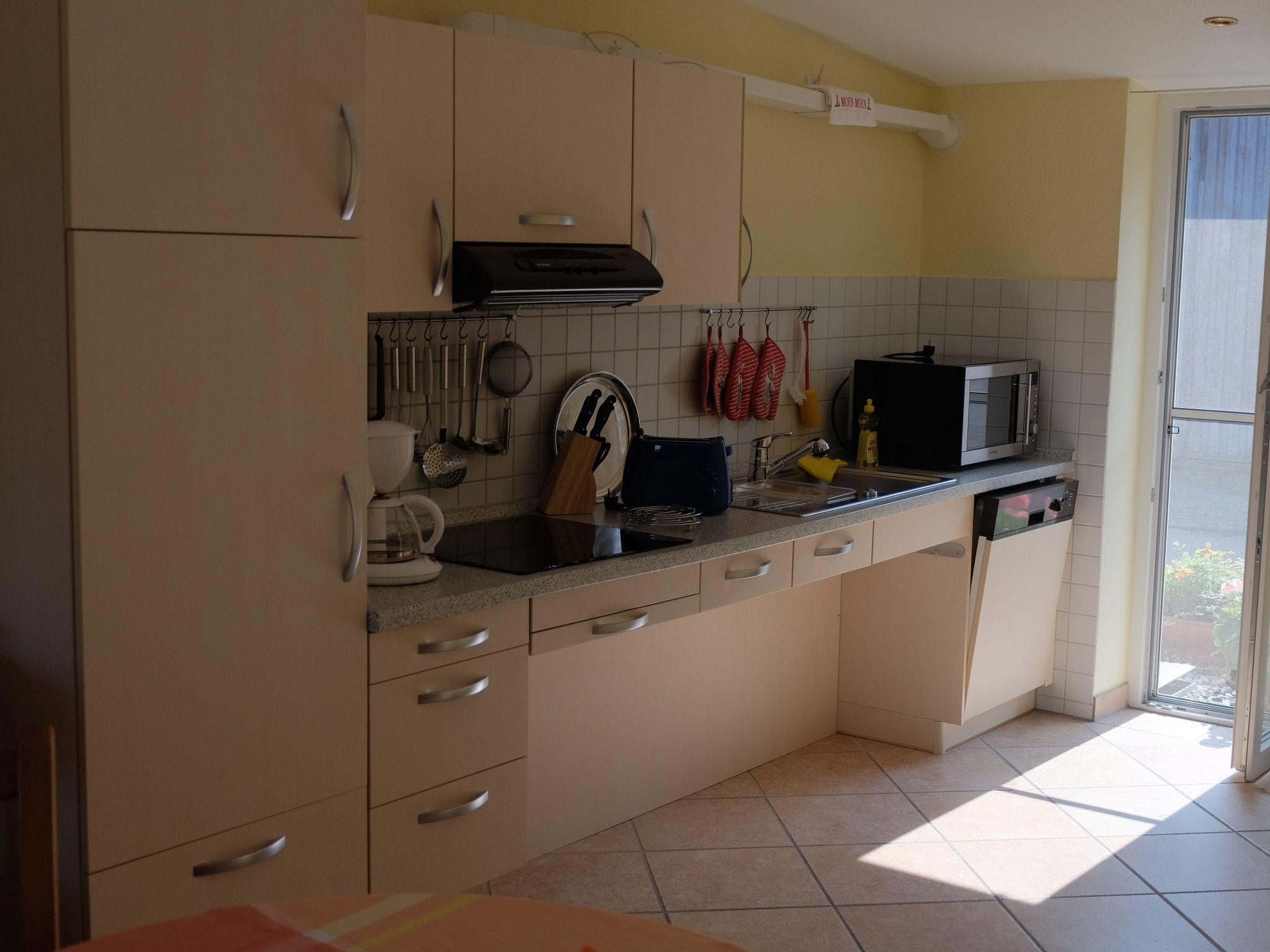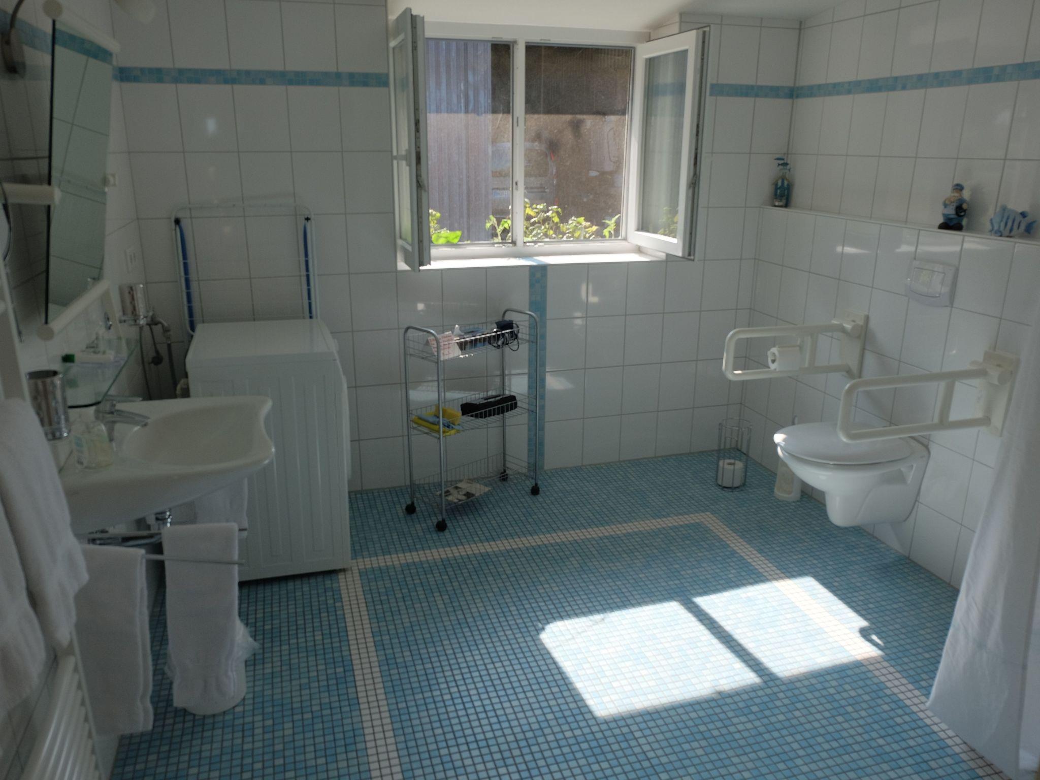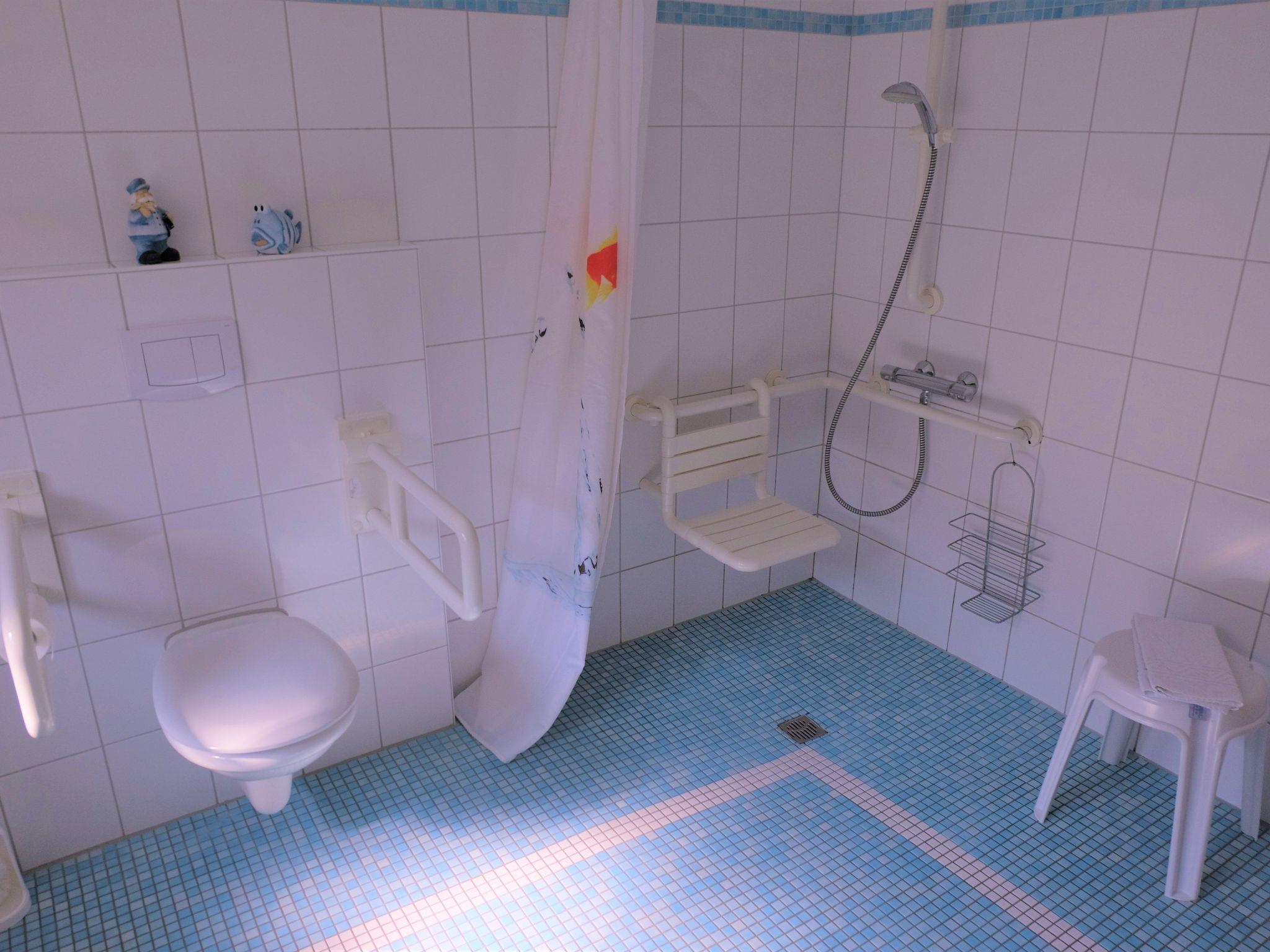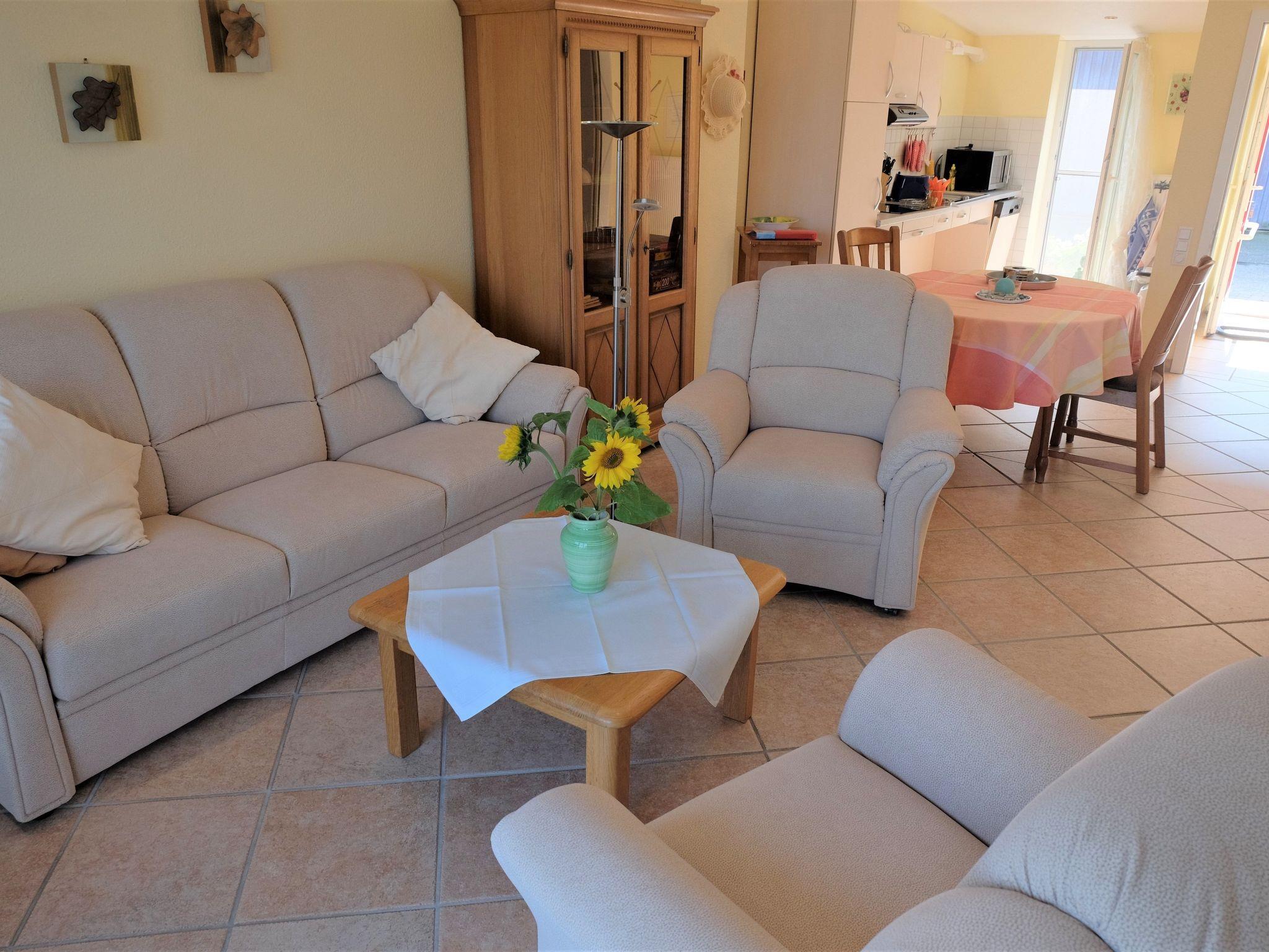 großzügig ausgestattet, für Rollstuhlfahrer geeignet nach DIN - Norm, hell und freundlich,Auf Wunsch "Möbelrücken". Unterfahrbare Küchenzeile komplett eingerichtet mit Spülmaschine, Kombinierter kleiner Backofen/Microwelle, Flachbild - TV, kl. Stereoanlage, Waschmaschine. Trocknernutzung gegen Gebühr im Haupthaus. WLAN im Haupthaus, mit etwas Hilfe barrierefrei erreichbar. Fußbodenheizung zusätzlich im Wohn/Küchenbereich und Badezimmer. Schlafraum Doppelbett 2.00 x 2.00 m, Schwebetürenschrank, kleine Sitzguppe.Wohnzimmer Sofa und 2 Sessel und Tisch, offener Bereich zur Küche mit großem Eßtisch und Stühlen.