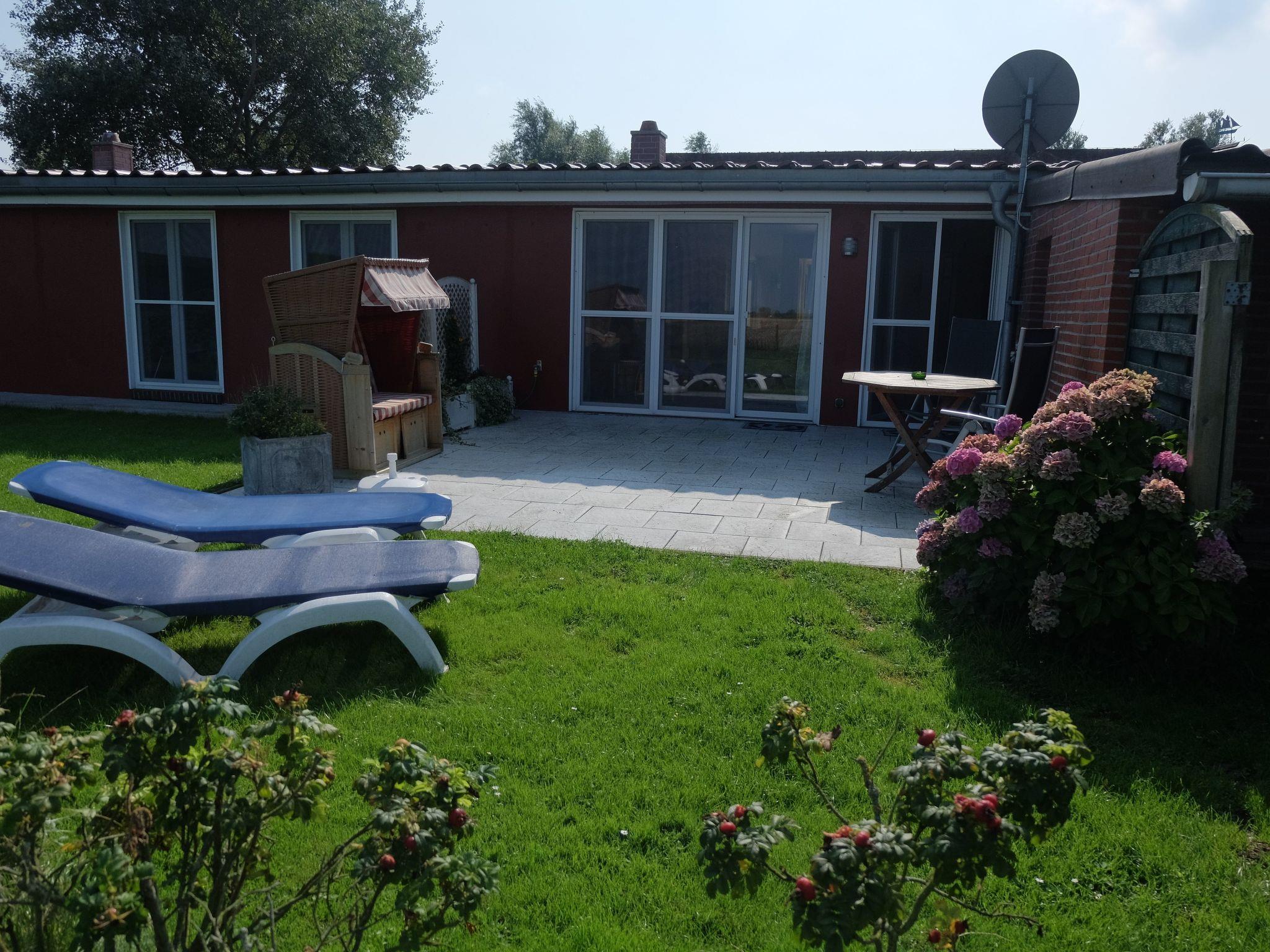 Eigene Terrasse mit Liegestühlen, Strandkorb, Gartentisch und Stühle, Sonnenschirm. Abschließbarer gemeinschaftlich genutzter Fahrradraum mit Auflademöglichkeit f. E - Bikes und Rollstuhl. Ebenerdig. Großer Garten und große Spielwiese gemeinschaftlich.