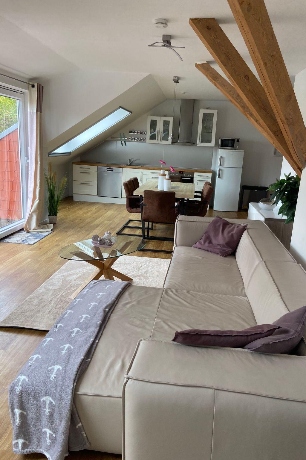 Der Zugang zur Ferienwohnung Manslagt verläuft über die aufwendig erstellte Galerie, die im Herzen des Gulfs, dem geselligen Scheunentrakt liegt. Bei Ihrem Feriendomizil handelt es sich um eine im Jahre 2017 neu gebaute Dachgeschosswohnung mit Balkon, die sich über eine Wohnfläche von 77 m² erstreckt, mit ihren 23 m² Schrägen als Nutzfläche aber deutlich größer wirkt. Die Ausstattung der modern gestalteten Wohnung lässt kaum Wünsche offen: Es erwarten Sie ein großer Wohnraum mit offener Küche, zwei Doppelzimmer, jeweils mit TV, sowie ein großzügiges Duschbad und ein in die Wohnung integrierter Abstellraum. Der Wohnraum ist um eine in das Dach eingelassene Loggia erweitert, von der aus Sie die Weite Ostfrieslands genießen können. Im Wohnbereich entspannen Sie auf der bequemen Ledercouch nach einem Tagesausflug. Dabei sorgt der LCD-Flachbildfernseher für Unterhaltung am Abend. In den beiden Doppelzimmern, die einerseits mit einem 180 cm x 200 cm großen Doppelbett und andererseits mit zwei Einzelbetten à 90 cm x 200 cm möbliert sind, sind ebenfalls Flachbildfernseher vorhanden. Kleiderschränke und Kommoden bieten ausreichend Verstauungsmöglichkeiten für Ihre Reisegarderobe. Vor dem offenen Kochbereich befindet sich der Esstisch mit sechs bequemen Armlehnenstühlen. Die Küche ermöglicht Ihnen eine komfortable und umfangreiche Selbstversorgung inklusive Geschirrspülmaschine, Ceranherd mit Backofen, Kühlschrank mit Gefrierfach, Mikrowelle, sowie den üblichen Kleinelektrogeräten (Kaffeemaschine, Toaster, Wasserkocher), Milchaufschäumer und zahlreichen Utensilien. Das Badezimmer ist als Duschbad mit einer großen ebenerdigen Duschkabine, Handtuchtrockner, WC und Handwaschbecken konzipiert. Die kostenlose Internetverbindung per WLAN, eine Waschmaschine und die Fußbodenheizung runden die Ausstattung ab.