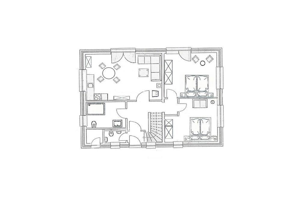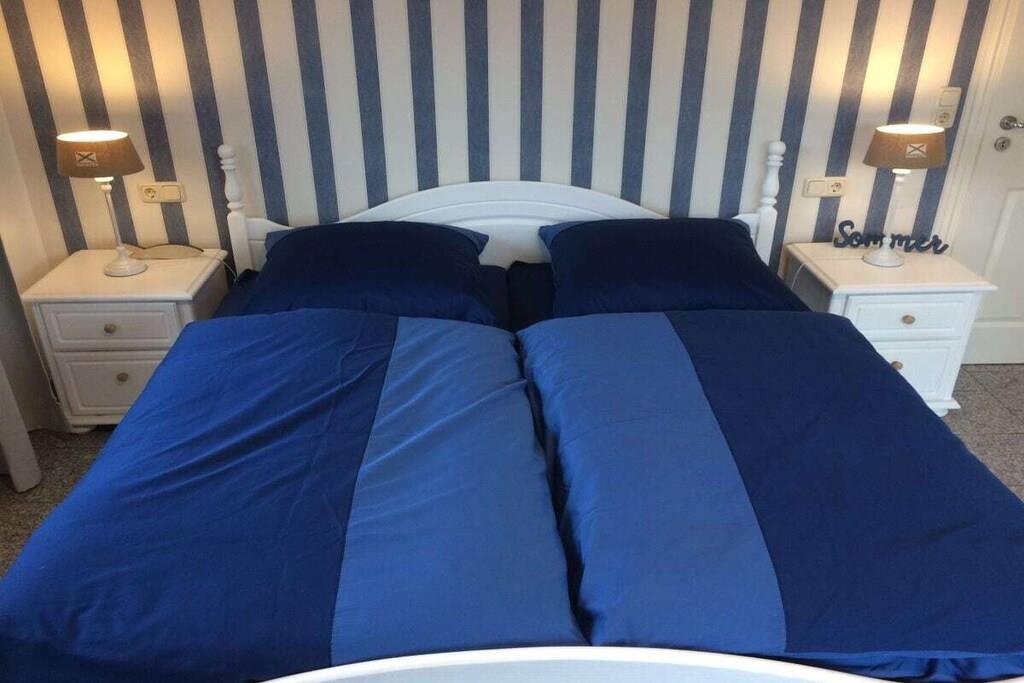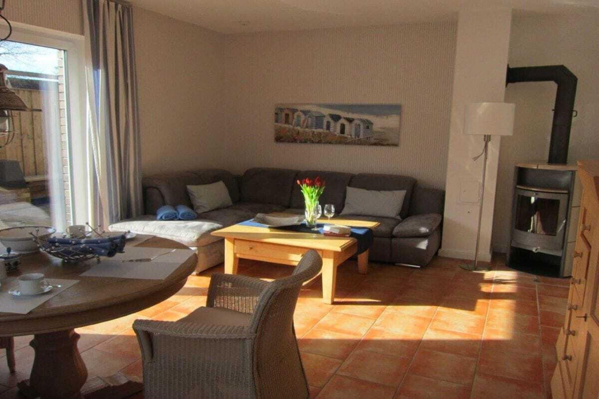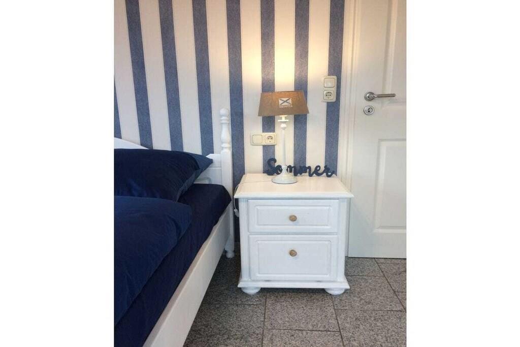Neue hochwertige Ferienwohnung mit nordischer Behaglichkeit. Maritime Gemütlichkeit in weiß / blau und massiven Pinienmöbeln. Diese exklusive, rollstuhlgerechte Ferienwohnung bietet alle Annehmlichkeiten für bis zu 4 Personen mit oder ohne Handicap, damit sich unsere Gäste vom ersten Moment an wohlfühlen. Der helle Wohn- und Essbereich lässt es an nichts fehlen. Um den massiven runden Pinientisch laden bequeme Loomchairs zum Verweilen ein. Die moderne Hochglanzküche ist mit Spülmaschine, Dunstabzugshaube, Backofen, Kaffekapselmaschine, Kaffeefiltermschine, WMF Töpfen und reichlich Küchenutensilien ausgestattet. Ihnen steht hochwertiges Porzellan der Marken "Friesland" kleine Brise und "Hutschenreuther" Zwiebelmuster sowie Gläser von Leonardo zur Verfügung. Eine komfortable Eckgarnitur und der großen Flachbild-Smart-TV laden zum Entspannen ein. Ein weiteres Highlight ist der Kaminofen. Sie finden Spiele- und Bücherauswahl vor. Von der Wohnstube gelangen Sie direkt auf die Terrasse. Diese bietet hochwertige Flechtmöbel und Sonnenliegen. Die 70 m² große Erdgeschosswohnung hat 2 geräumige Schlafzimmer. Die Betten haben die Komfortgröße 180 x 200 cm. Große Schränke bieten ausreichend Stauraum. Schlafzimmer II ist lichtdurchflutet und mit maritimen Flair. Von hier können Sie direkt auf die Terrasse treten. Eine kleine Sitzgruppe und ein 2. Flachbild-TV bieten ideale Vorraussetzungen für Rückzugsmomente. Das Schlafzimmer I ist in dezenten Grautönen eingerichtet. Eine kleines Ledersofa sorgt für zusätzliche Gemütlichkeit. Die Ferienwohnung bietet ein großes Bad mit bodengleicher Dusche. Ein 2. separates WC liegt für die Hausgäste im Treppenhausbereich.