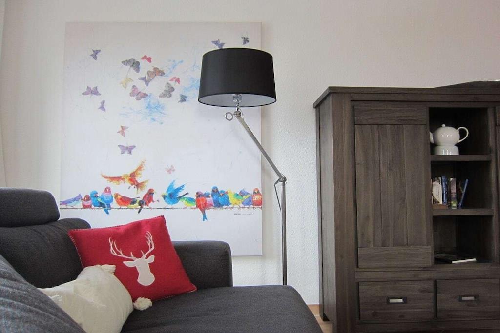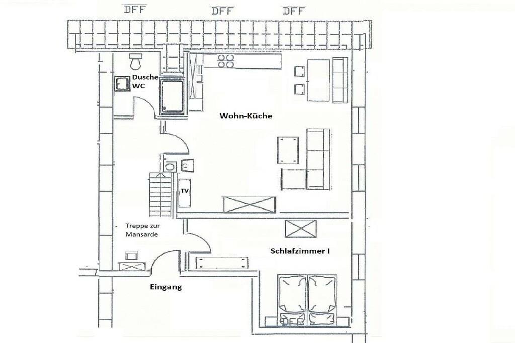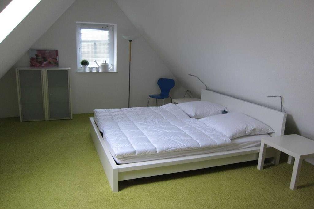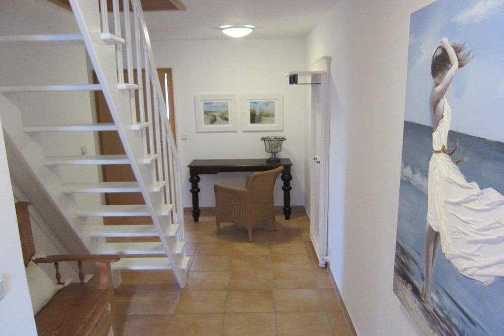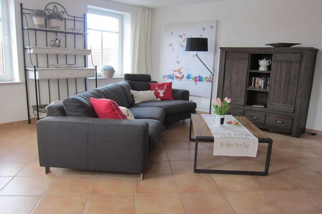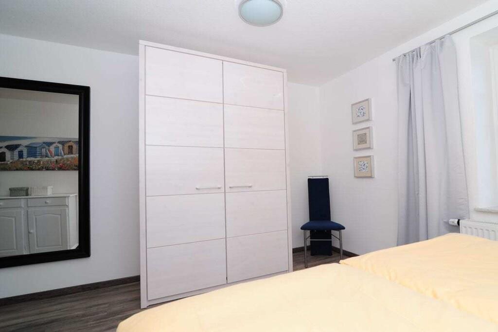 Gemütliche neu renovierte Ferienwohnung mit sep. Eingang und gutläufiger breiter Treppe. Die Ferienwohnung bietet eine geräumige Wohnküche mit behaglichem Kaminofen, großer Einbauküche, massiven Holzmöbeln und einer bequemen Wohnlandschaft. Das 1. Schlafzimmer liegt auf gleicher Ebene und präsentiert sich in trendigen weißen Massivholz. Das Bett bietet Komfortbreite (180x200) und der Kleiderschrank ausreichend Platz für Ihre Urlaubsgarderobe. Das neue moderne Bad ist mit Raindusche (80x120), Waschtisch, WC und Fenster ausgestattet. Die weitläufige Mansarde beherbergt ein weiteres gemütliches Schlafzimmer mit großem Doppelbett (180x200), Schreibtisch und Kleiderschrank. Zur Ferienwohnung gehört ein Gartentisch mit 4 Stühlen für sonnige erholsame Stunden.