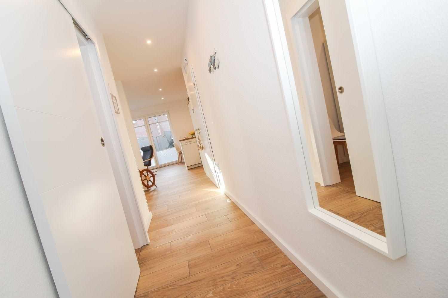 Das gesamte Erdgeschoss ist mit Fliesen in Holzoptik ausgestattet. Geheizt wird im gesamten Haus mit einer Fußbodenheizung, die natürlich für jeden Raum separat eingestellt werden kann. Nahezu ausnahmslos sind LED-Deckenspots verbaut.