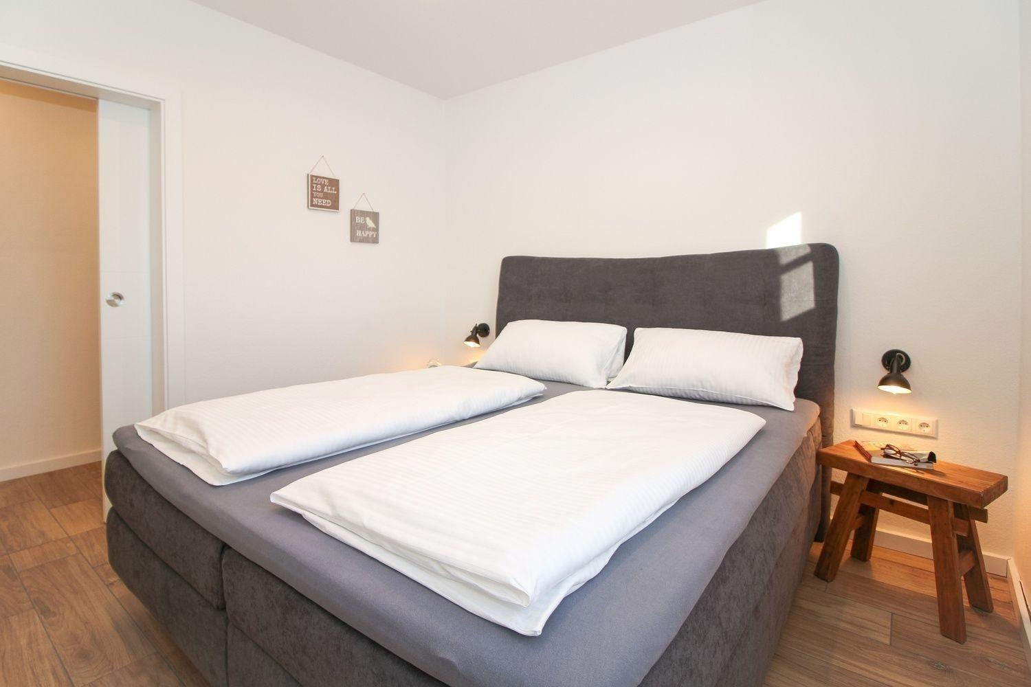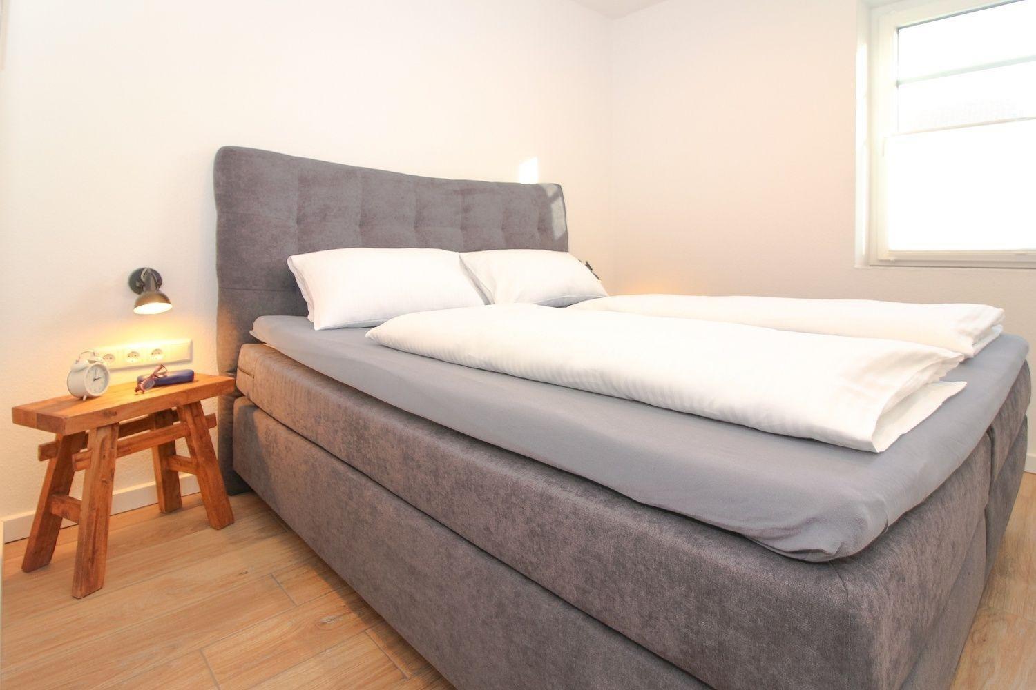Im Schlafzimmer befindet sich ein bequemes Boxspringbett. Ein Kleiderschrank und ein Flachbild-TV, das auf einer Kommode steht, fehlen natürlich auch nicht.