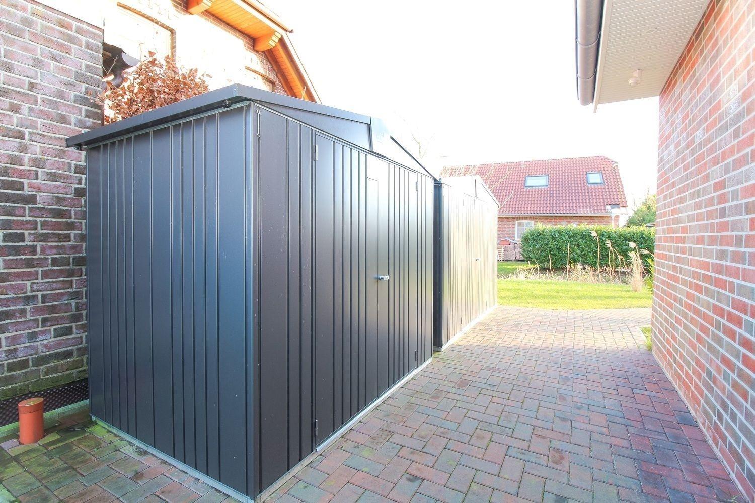 Der Terrasse am Haus, die sich vor den großen, lichtverwöhnten Fensterelementen befindet, schließt sich der Garten mit einer Rasenfläche an. Auf der Terrasse wartet ein gemütlicher Strandkorb auf Sie!