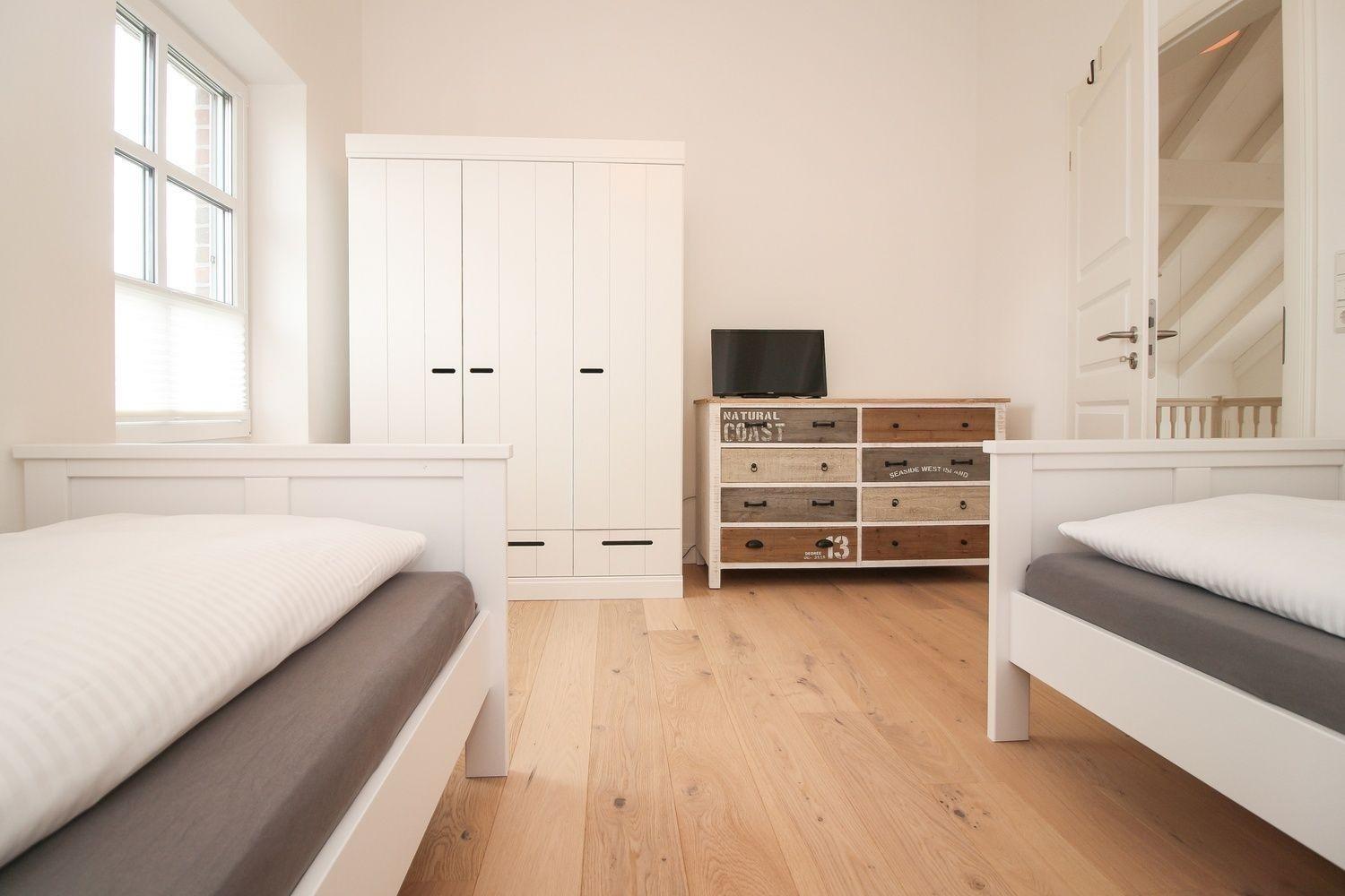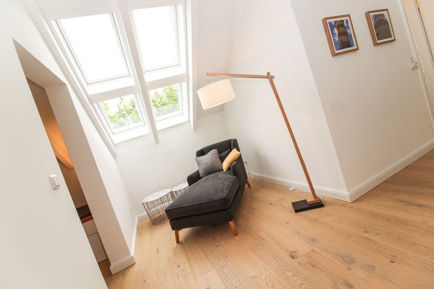 Im oberen Flur können Sie auf einem Chaiselounge unter den Dachfenstern ein Buch lesen oder in den Himmel von Greetsiel schauen. Von dort blicken Sie auch in ein kleines Butzenzimmer mit zwei gemütlichen Liegeplätzen, von wo aus Sie wiederum den Deich fest im Blick haben.