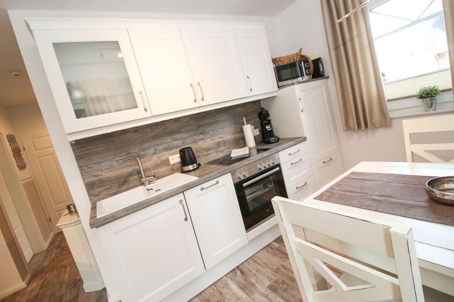 Im Wohn-/Essbereich befindet sich eine sehr gut ausgestattete Küchenzeile. Neben der Terrasse, die sich vor dem großem, lichtverwöhnten Fensterelement befindet, können Sie auch in einer geschützten Rückzugsecke auf der zweiten Terrasse die Greetsieler Frischluft genießen.