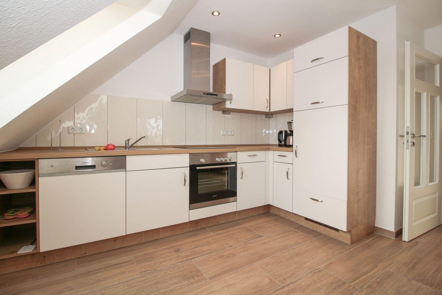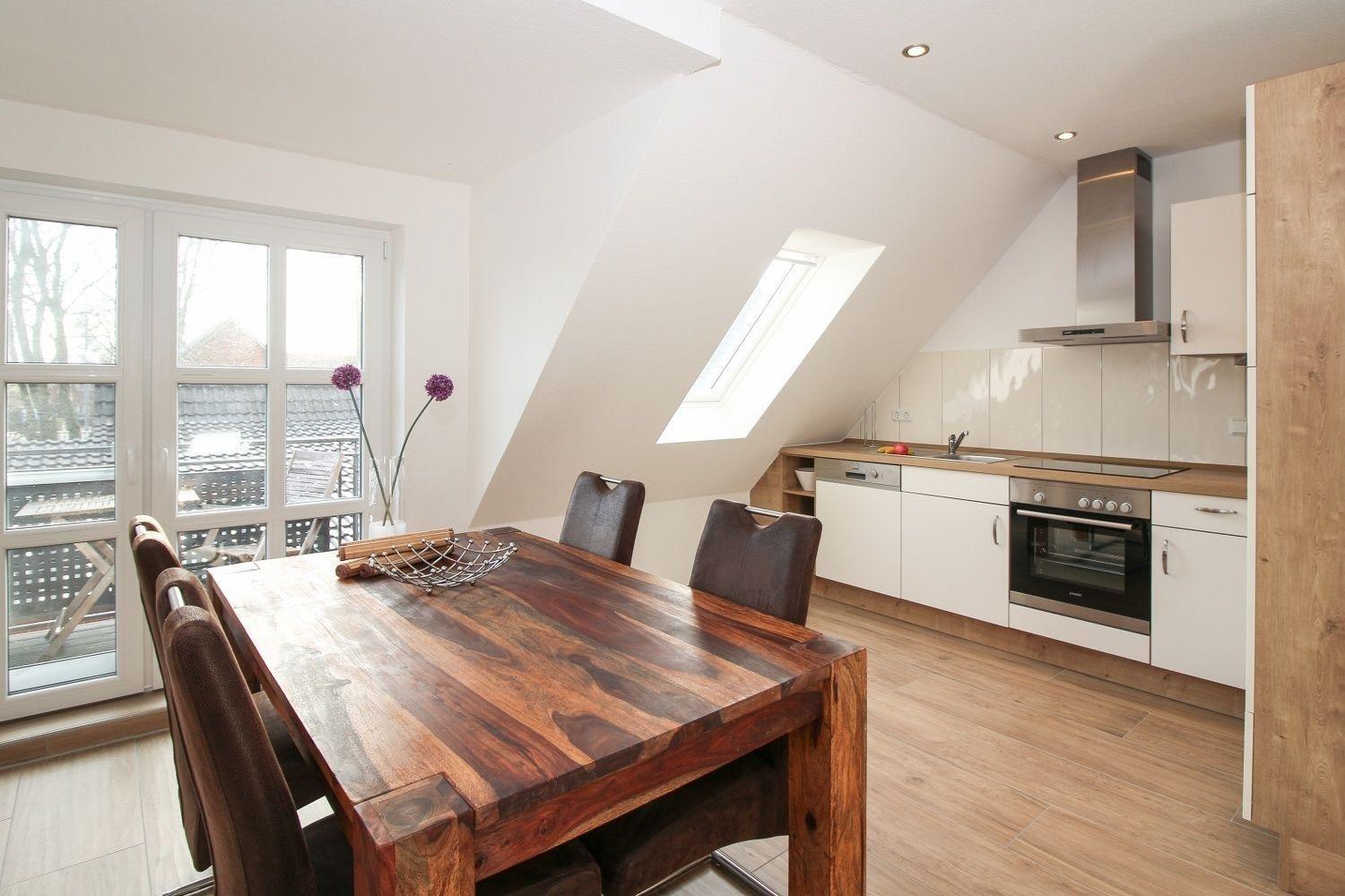 Die Ferienwohnung Linnea befindet sich im Oberschoss und besticht durch eine harmonisch aufeinander abgestimmte Einrichtung mit großem TV und angeschlossenem Speisebereich. Die Küchenzeile ist professionell ausgestattet mit allem, was man benötigt.