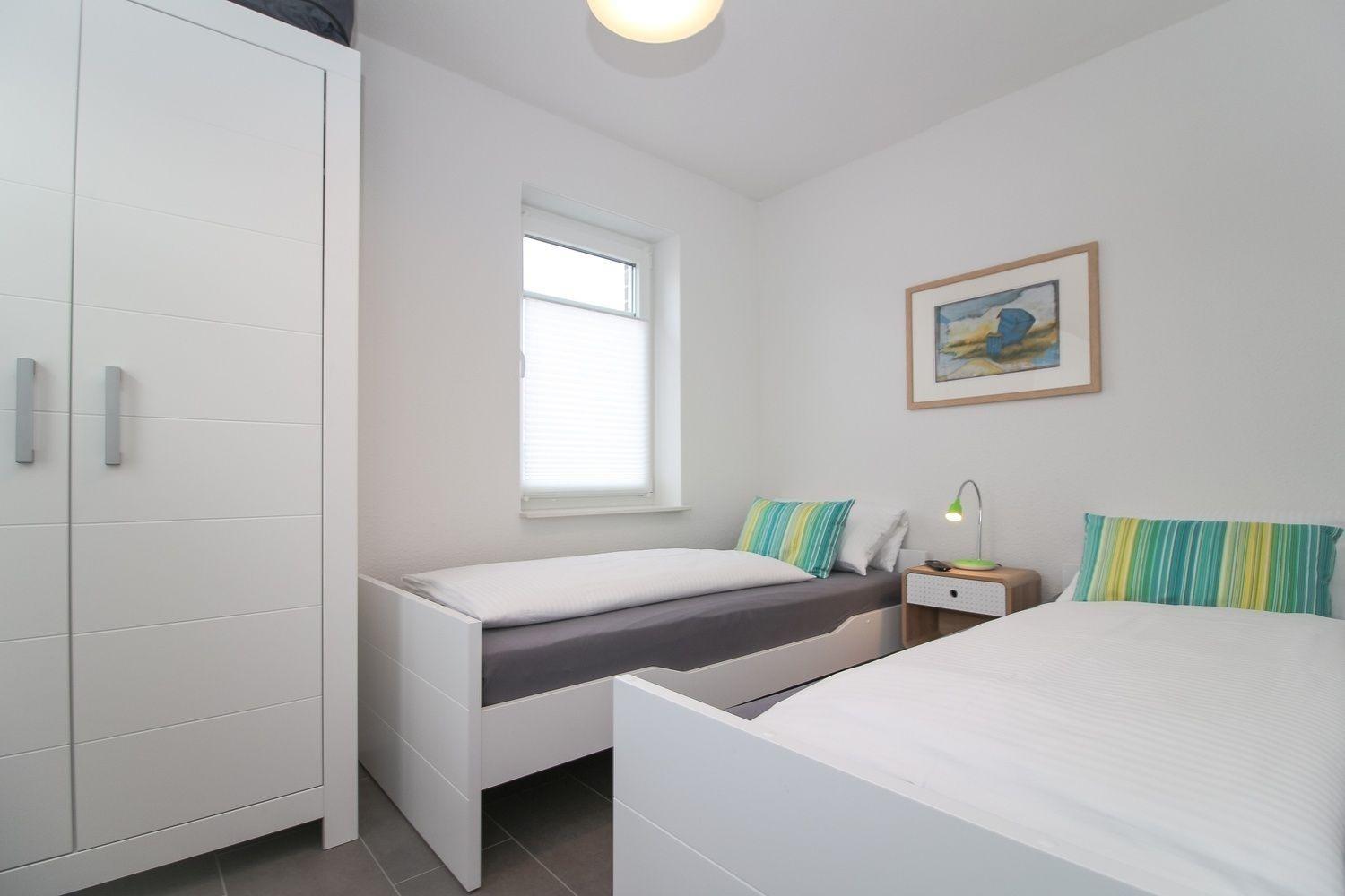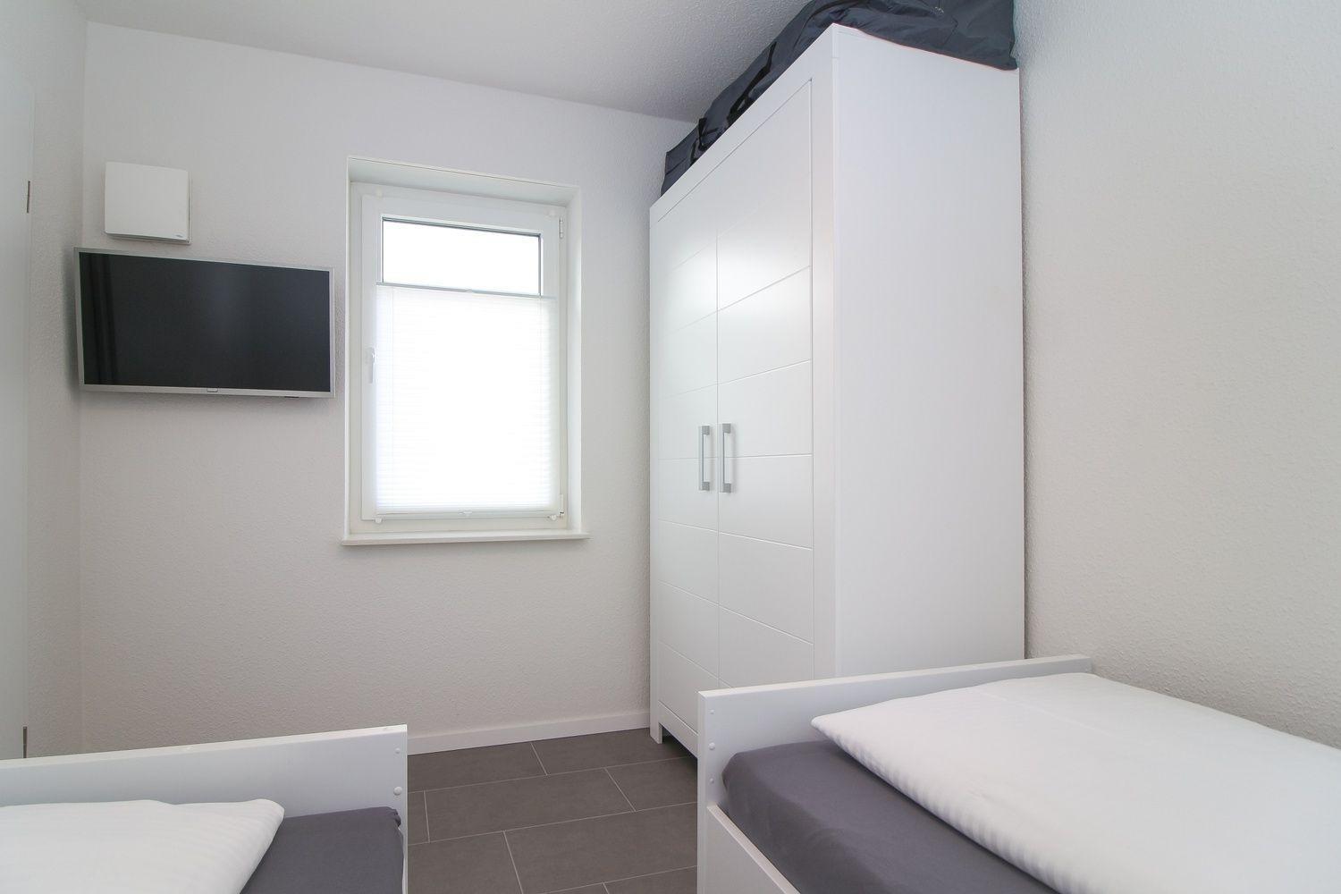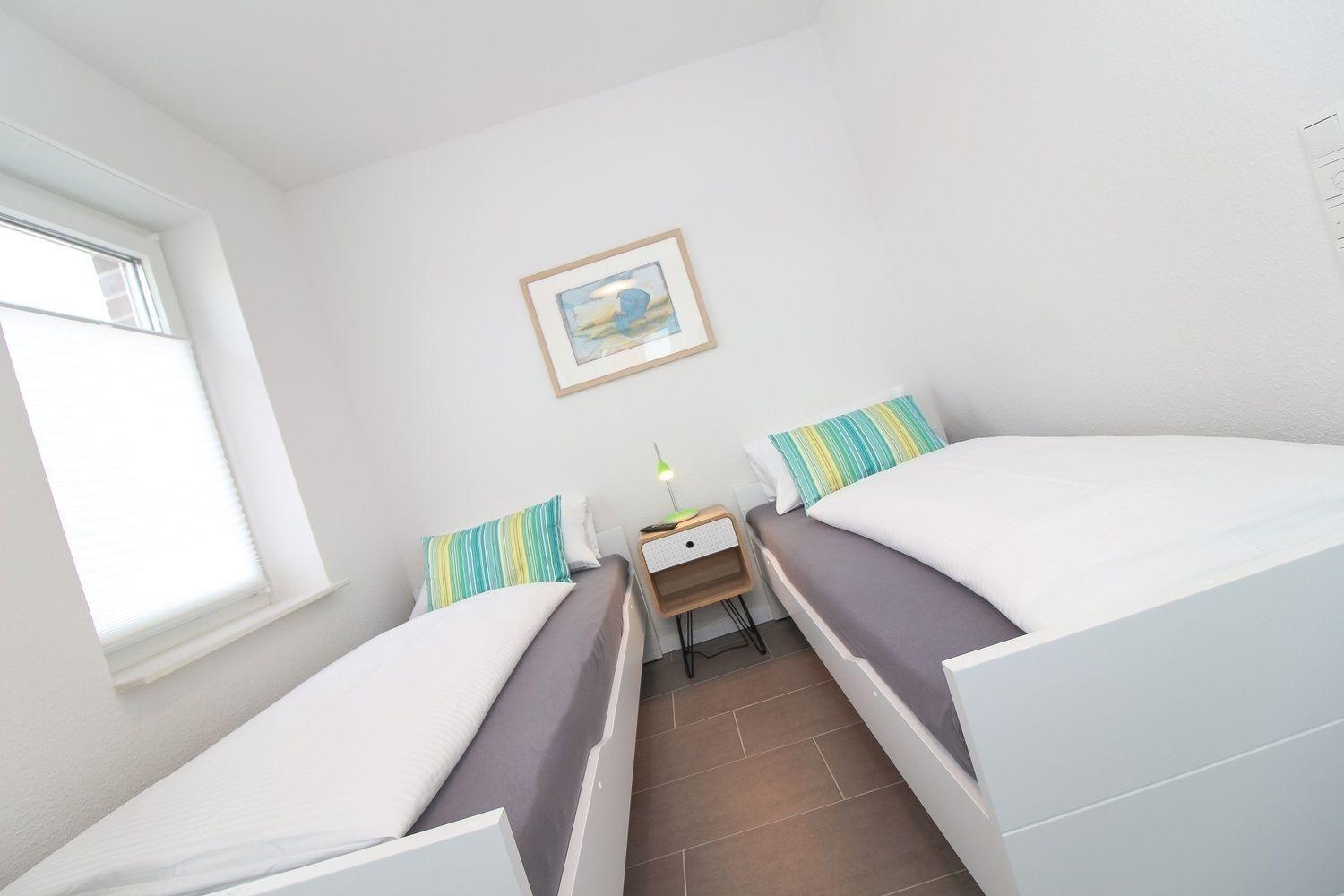 Die Wohnung verfügt über zwei Schlafzimmer, eines mit einem bequemen Boxpringbett, das andere mit zwei separaten Betten.