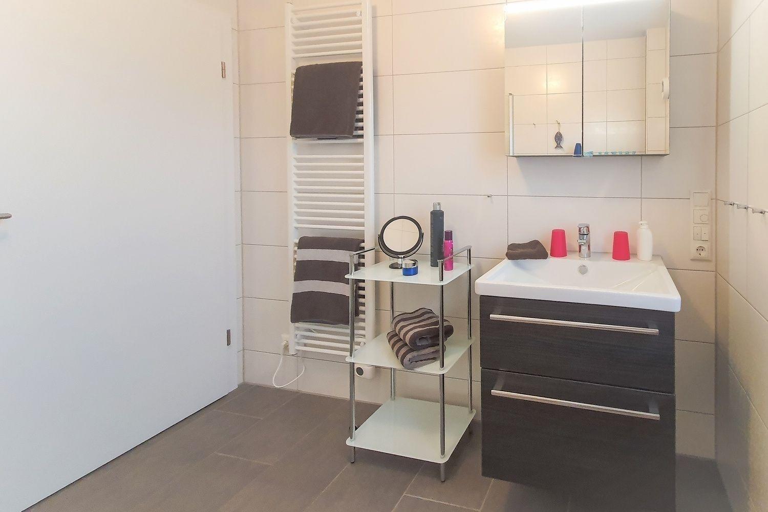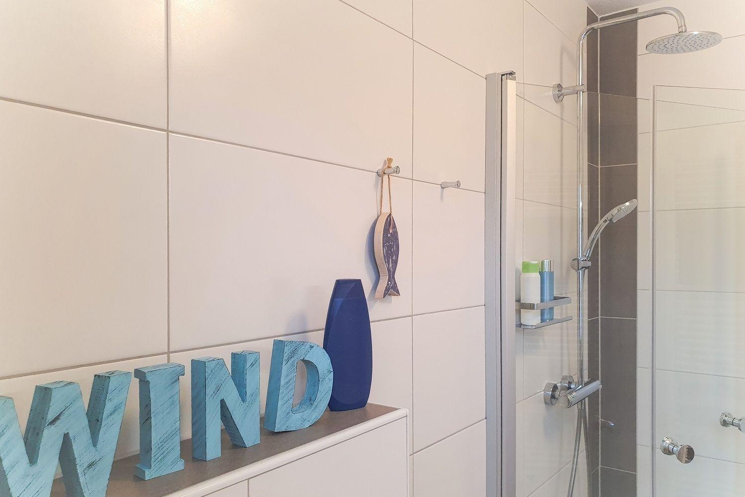 Das Bad ist mit einer großen, bodentiefen Dusche mit Regenbrause, einem Waschtisch mit Spiegel- und Unterschrank sowie einem Handtuchwärmer ausgestattet.